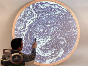 大瓷盤上的「景德鎮」簡圖,分別帶出高嶺土運輸線、瓷器生產線、商戶銷售線