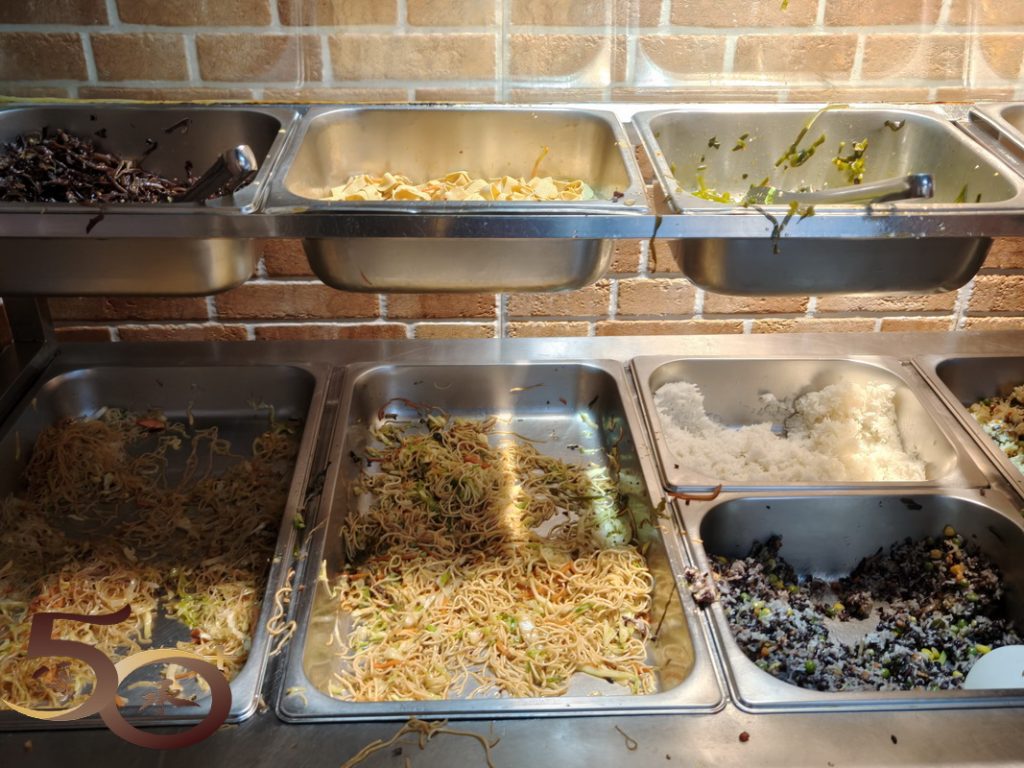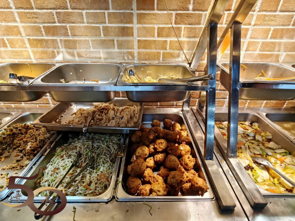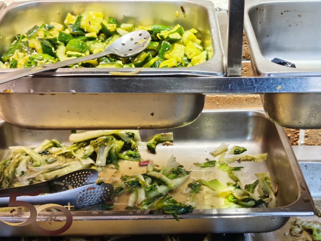 在二樓電梯旁已是枱連枱的盛況,點評二維碼在收銀櫃枱用不到,需由另一名工作人員跟進。領取碟,碗和筷子用餐工具後排隊取食。素菜選擇有數十款,但靠牆的L型食物枱偏小,地方不夠,有的食材還要堆疊,感覺甚差,雖然食客們十分有秩序,排隊輪候取食,但狹窄的空間,仿如回到從前受訓時配給食物的情況。