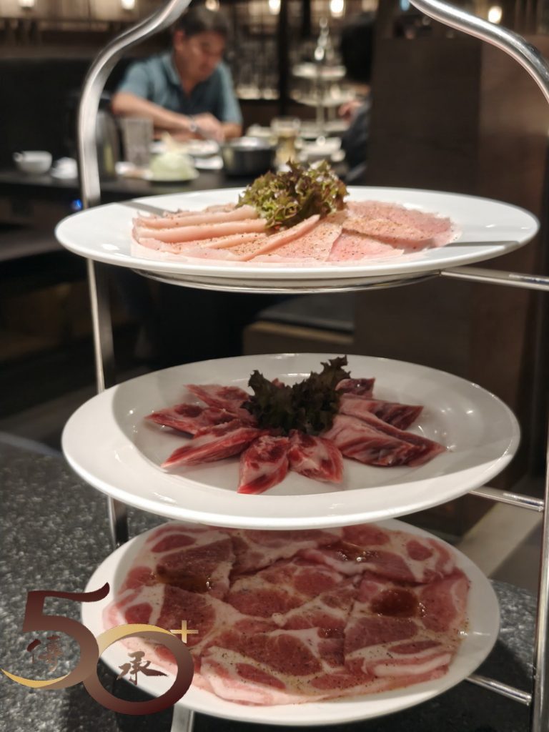 進店就座,大家不約而同先喝一口雞湯(整壼免費續添),暖暖身子。食材方面,以西式茶點架子盛載,一盆三碟,共四盆的肉類各有「名稱」。雖然上枱時侍應會逐一介紹,但對於「食肉獸」來說意義不大,只覺每片肉經火烤後散發的濃濃肉香已極為吸引,入口細嚼更是嫰滑的肉質,可以瞬間吞下肚中,然後快快的再來另一片。