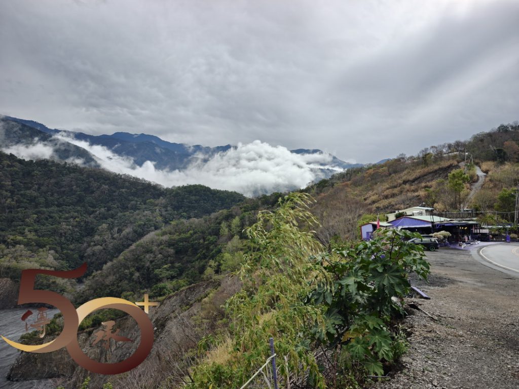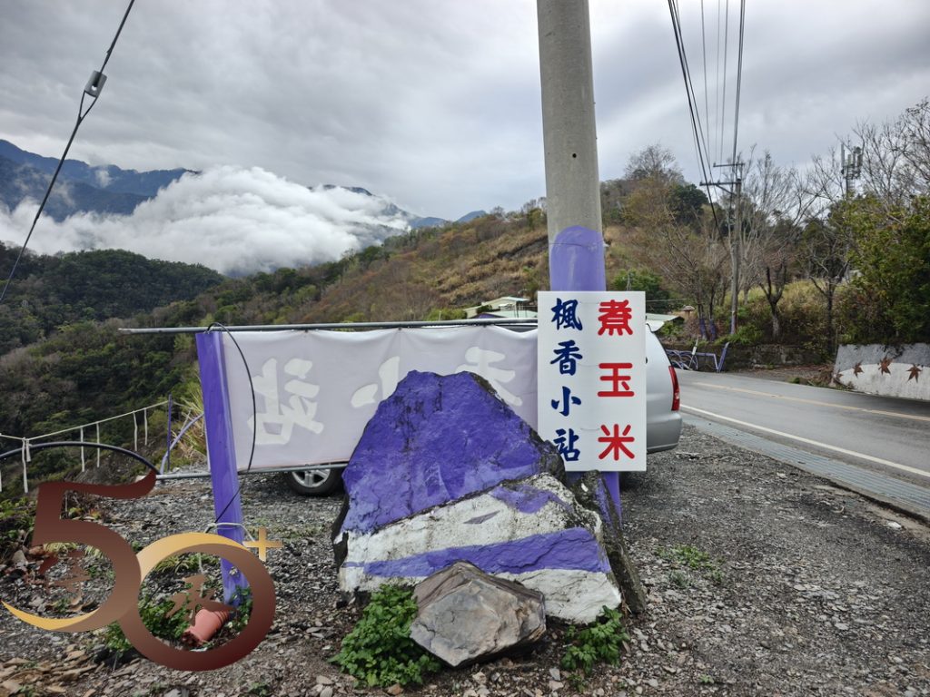 或許雨下的霧社就是「霧繞的社區」,「矇矓」就是「美」。幸而過橋後的上山路,天雨稍竭,換來「白雲」裊裊上升,既輕盈又搖曳,又是另一番風景。此外,路旁近百個排列整齊的「楓香小站」「掛幅」,若非與煮玉米等台灣小吃「同在」,還以為是什麼美食的競選廣告。