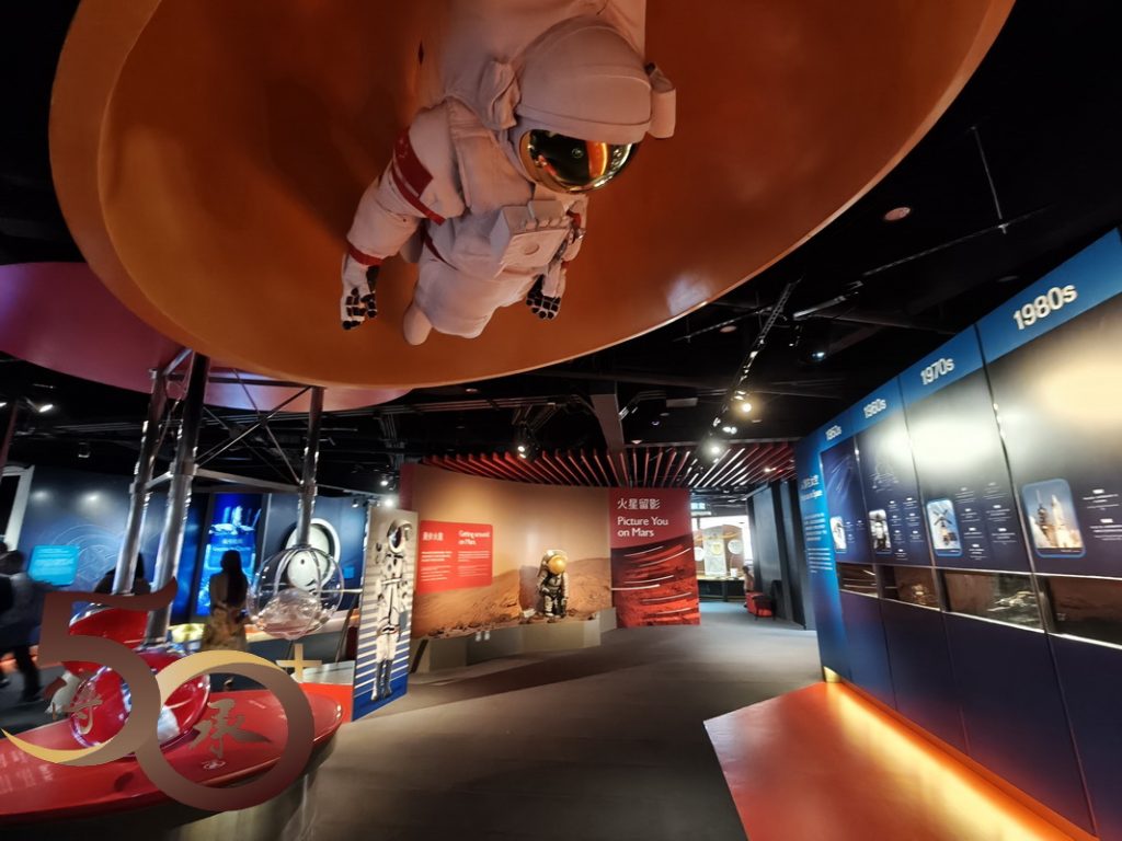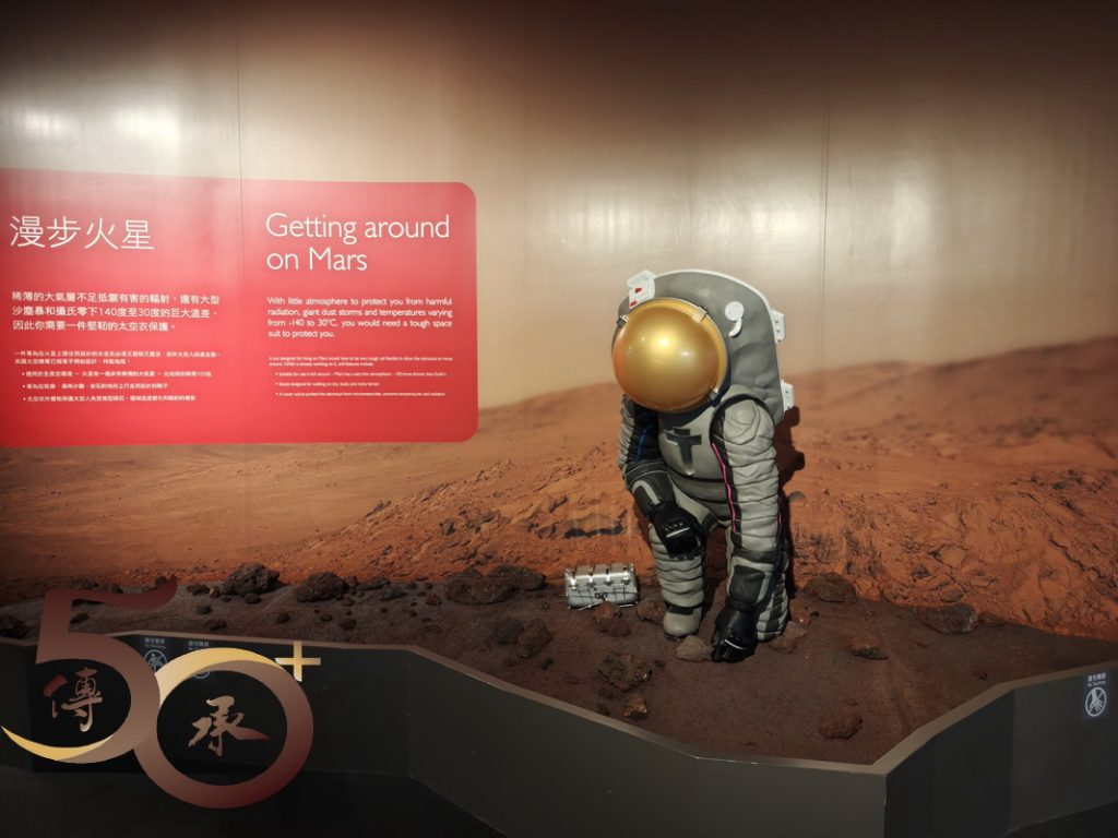 購票區旁是「太空探索展覽廳」,取得全年證後隨即進場參觀。大門處是「火星留影」情景,俯身檢拾火星石塊的太空人模型,仿如向每一名進場人士鞠躬致意。