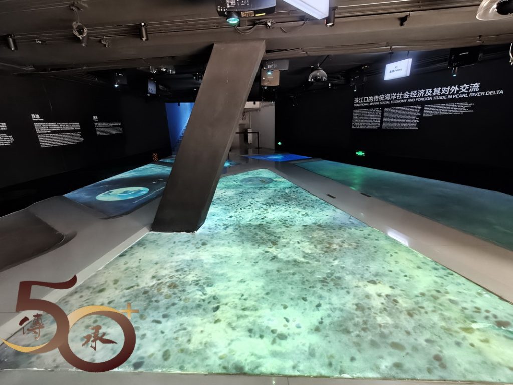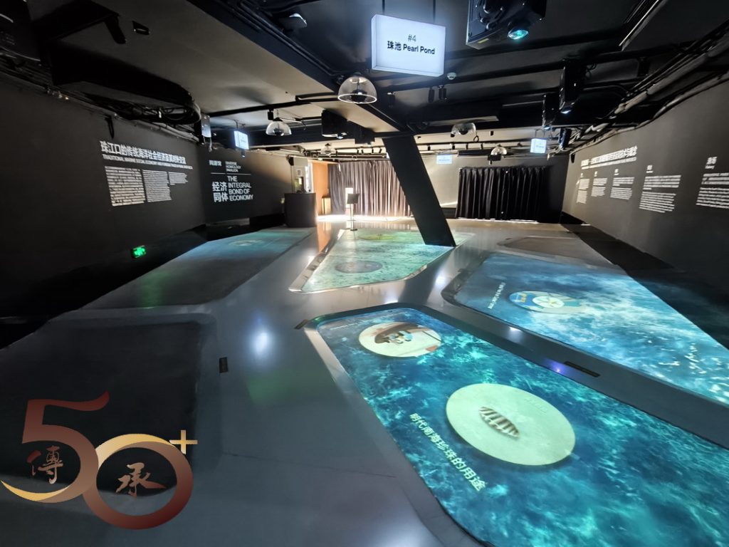 「同源館」一樓展廳以帶點「科幻」的地面玻璃影象,營造別出心栽的「海洋」環境,其中排在「古代珠江口區域的海洋經濟及其技術與觀念」主題首位的「沙田」,就是導賞課堂上老師提到,古稱媚川都的香港吐露港「採珠業」。