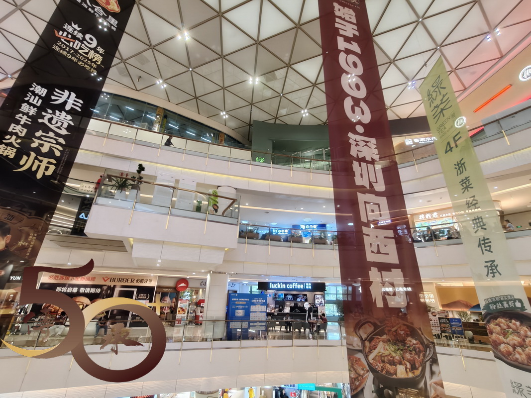 正午1200時由正門進入星河Coco Park商場,不論裝潢環境,還是店鋪食店,與深圳各大型商場無異,尤其是「留空」的天井垂着標示店家名稱的廣告「幡布」,或已成為「指定項目」,不能缺少。