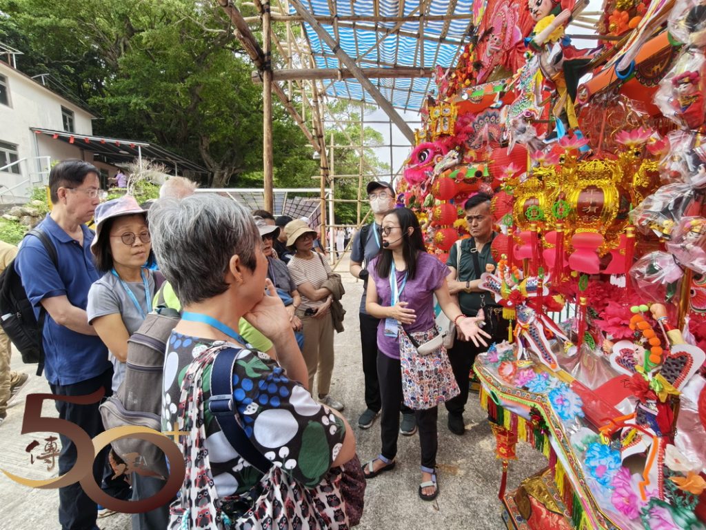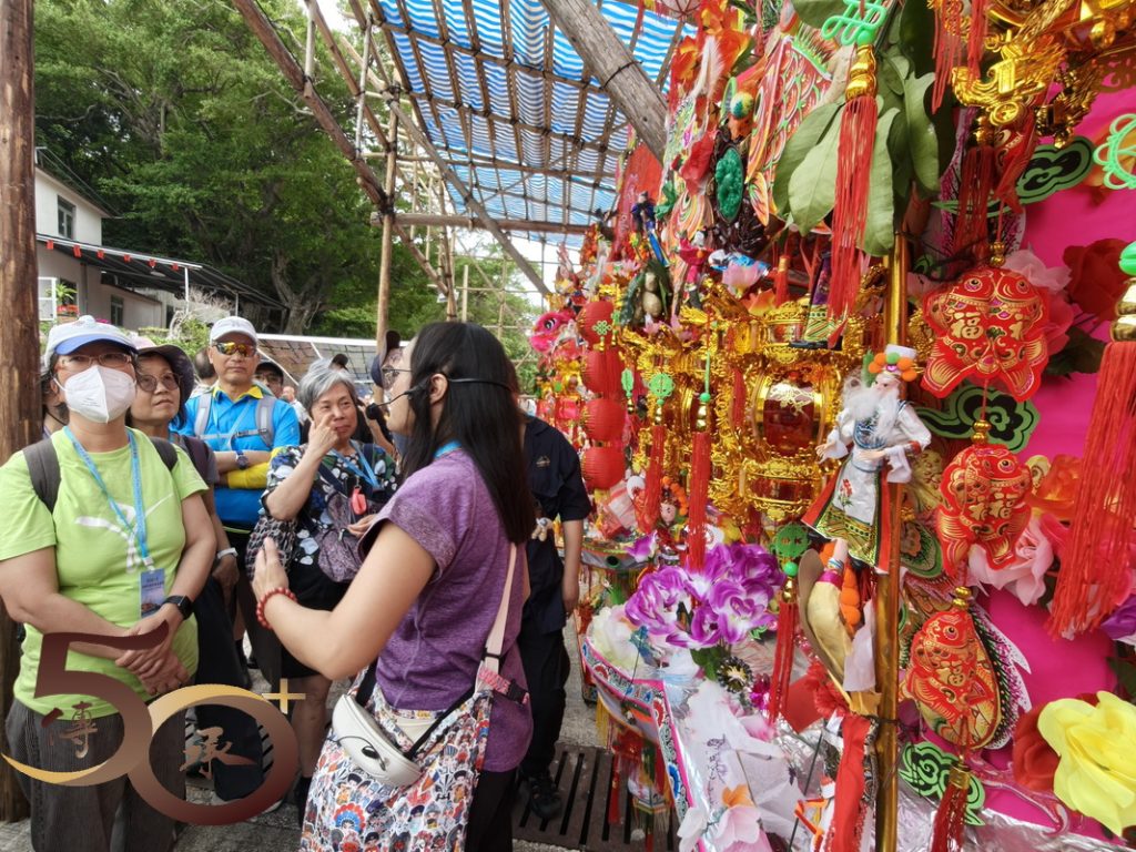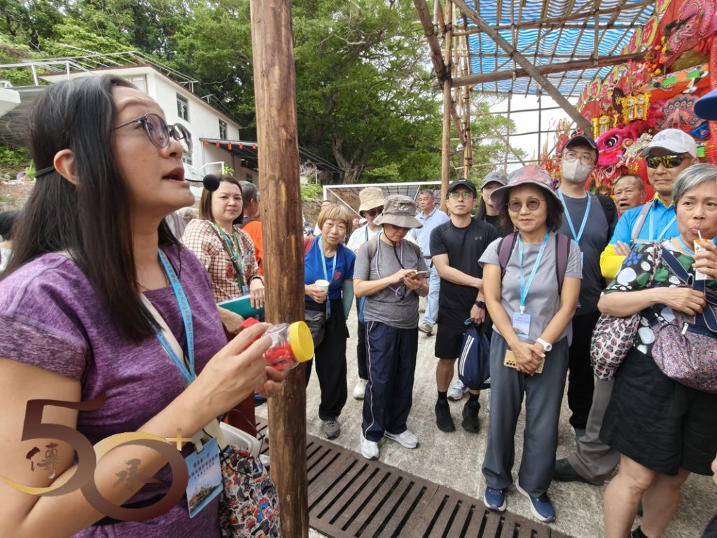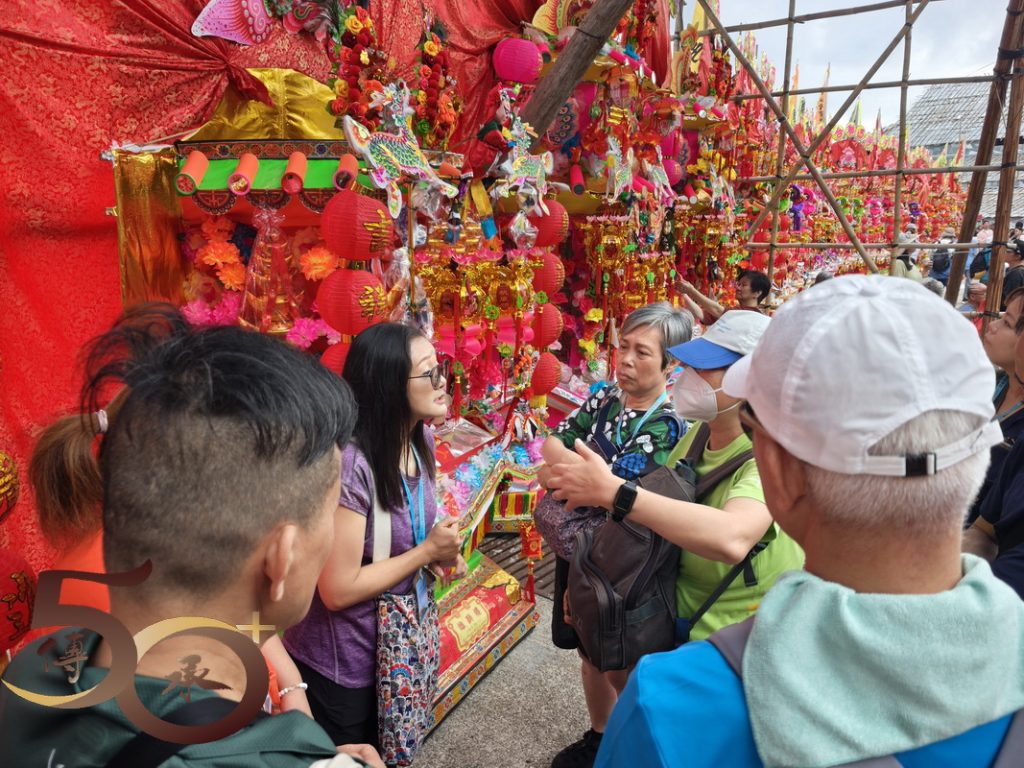 接下來來到數十個數米高的花炮前,由Bonnie講解花炮紮作技藝。Bonnie指出,花炮簡稱炮山。在洪聖誕酬神活動期間,一座座掛滿寓意吉祥聖物的花炮,由去年抽得花炮的堂會運回洪聖廟前「還炮」,以酬謝神恩。