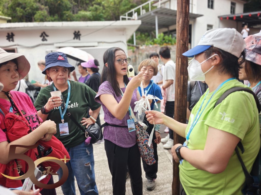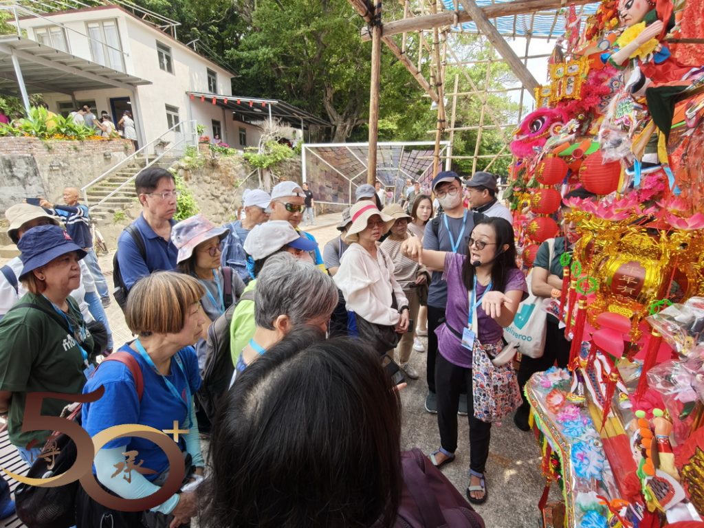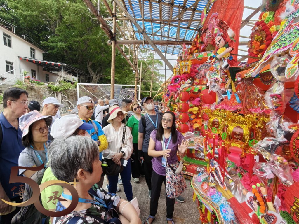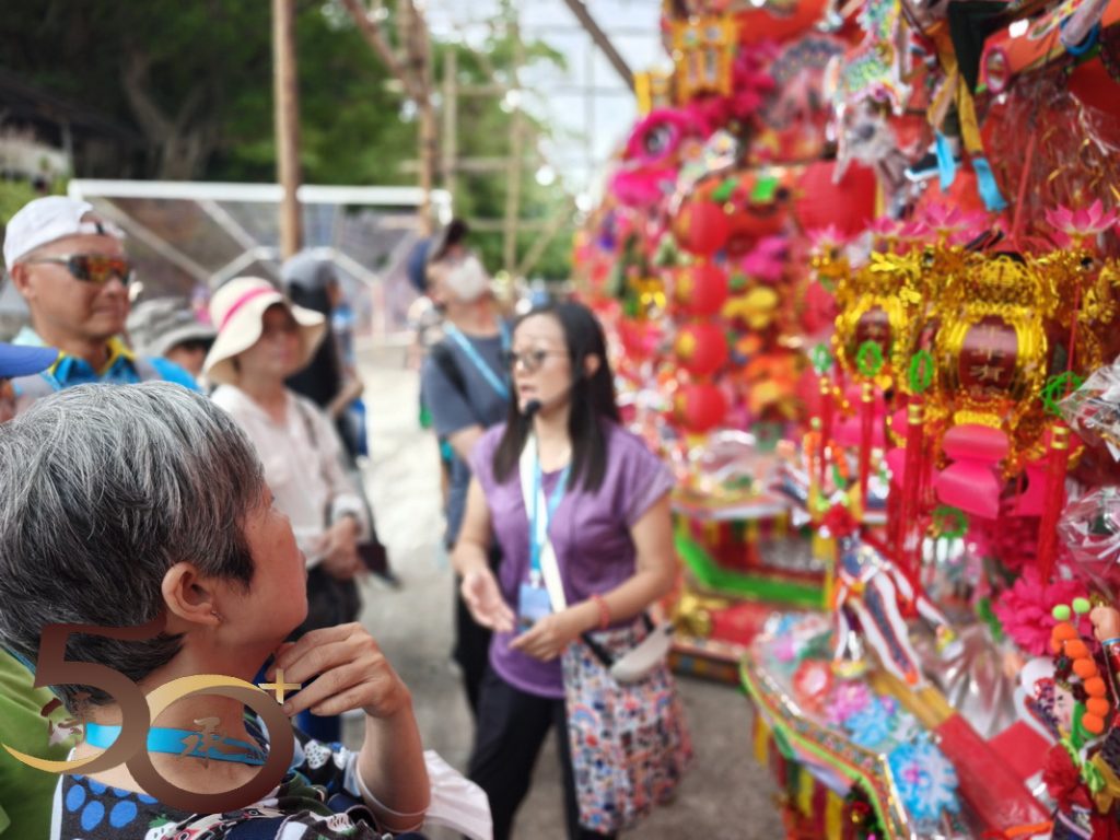 接下來來到數十個數米高的花炮前,由Bonnie講解花炮紮作技藝。Bonnie指出,花炮簡稱炮山。在洪聖誕酬神活動期間,一座座掛滿寓意吉祥聖物的花炮,由去年抽得花炮的堂會運回洪聖廟前「還炮」,以酬謝神恩。