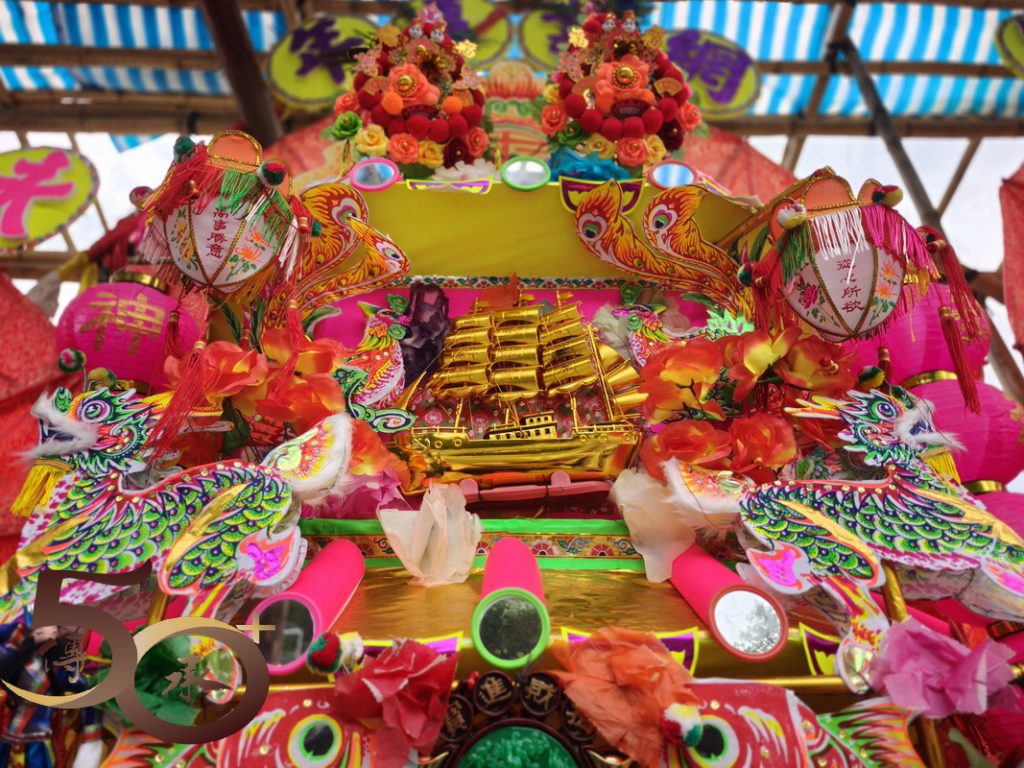 花炮紮作是香港傳統民間手工藝,已收錄在香港非遺名錄內。花炮分為三個部分,分別為「炮頂」、「炮身」和「炮躉」。其中「炮頂」設有「長紅、襟花、孔雀毛、金元寶和運財童子等;「炮身」中央為「洪聖爺」神壇,「兩側大多飾為龍柱,附加文武全才的文武二將,或大顯神通的八仙等「抽紗」神像,另有寓意年年有餘的「魚」、吉祥的「鳳」和添丁的燈籠等。
