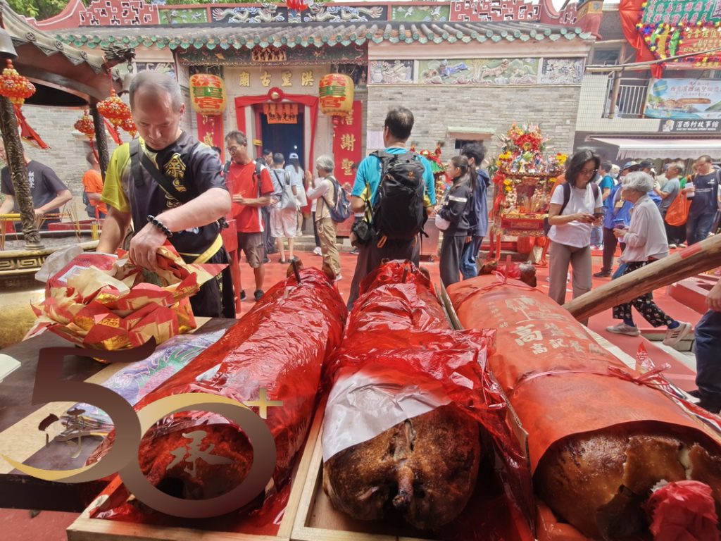 由早上下船至今,滘西洪聖古廟的參拜善信和「還炮」隊伍人接人,隊接隊,燒豬、水果,以至紅雞蛋的供品一批接一批,不單香爐「煙火不斷」,供桌上亦是「常滿」之景。