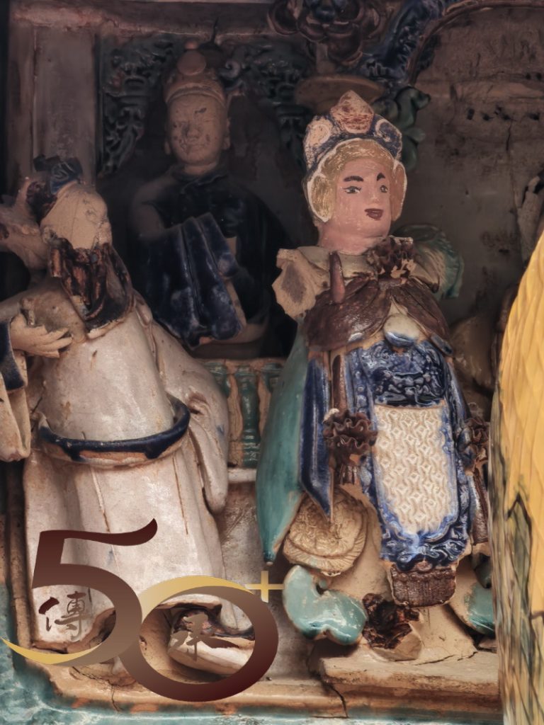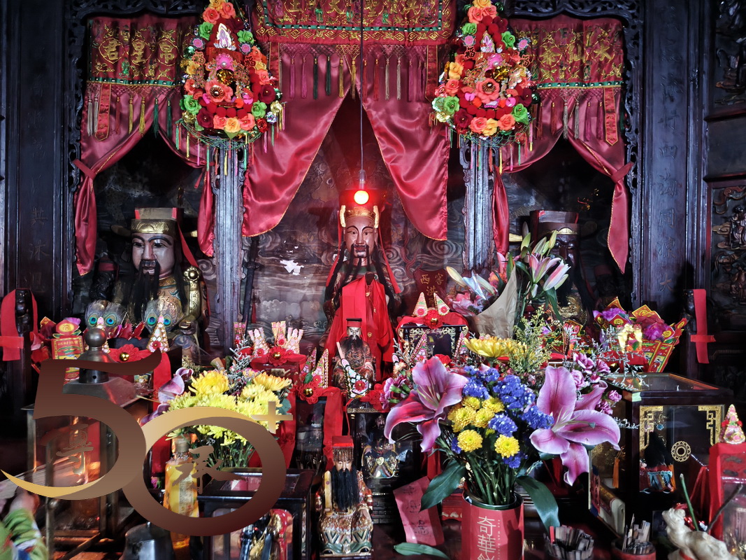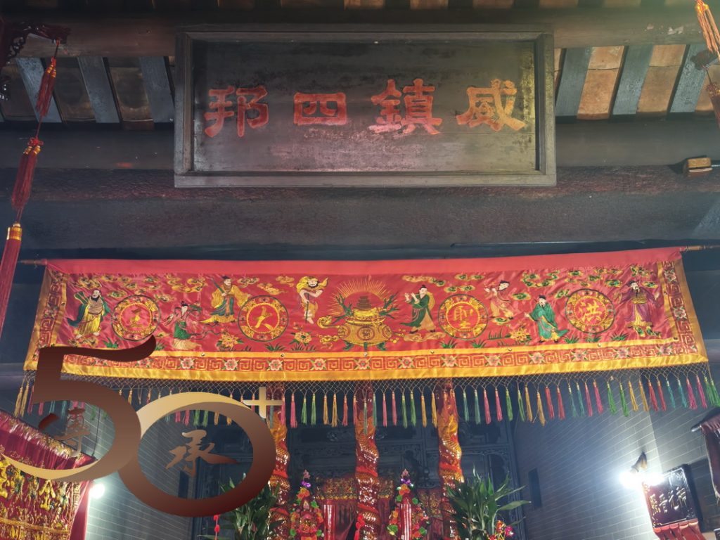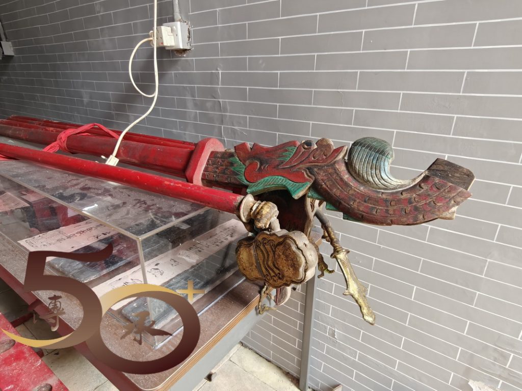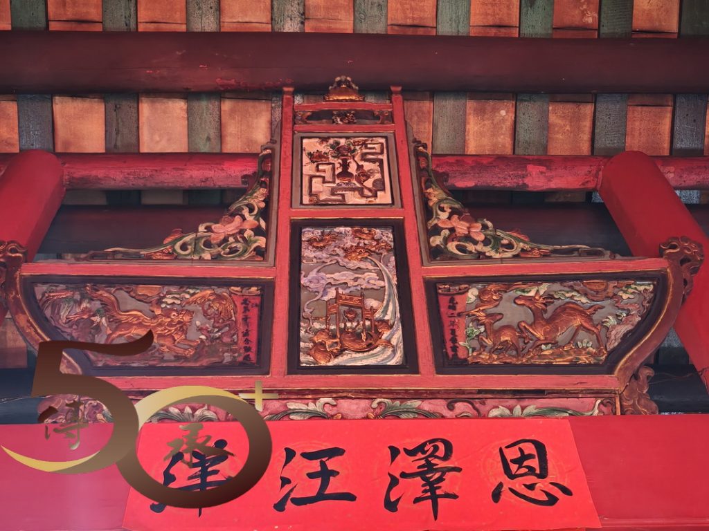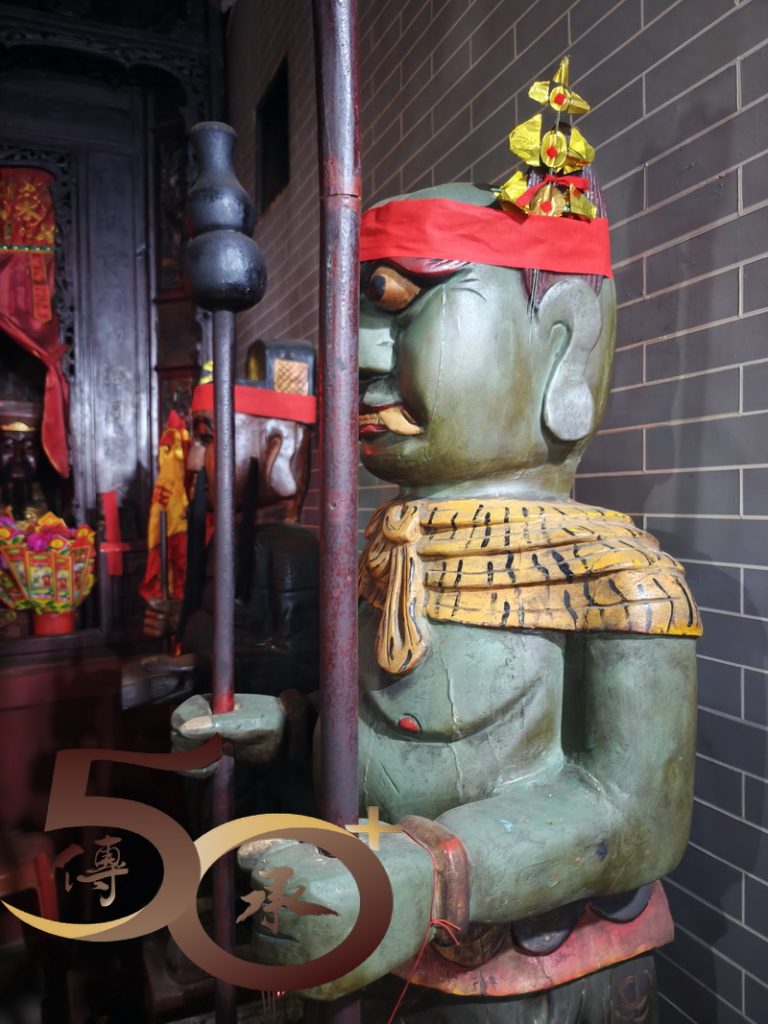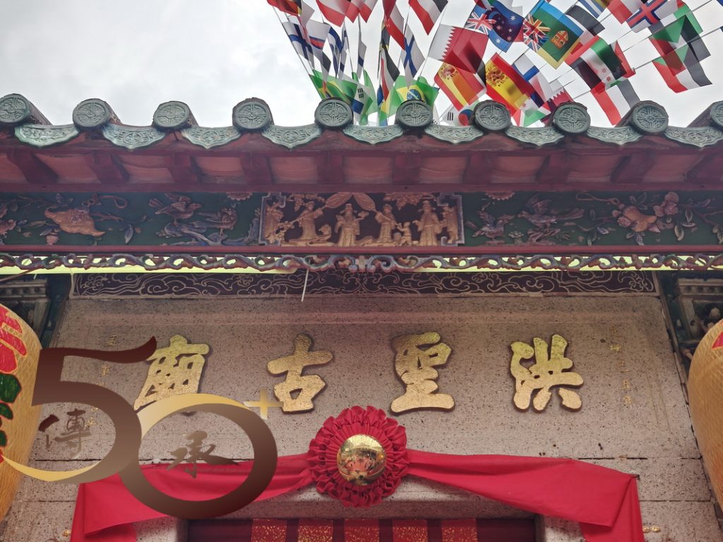 跨門檻進廟,擋中上方的彩屏是鯉躍龍門「禹門」的故事,上為寓意平安的花瓶,左方是代表「祿」的雙鹿,而右方則是寓意英雄會的「獅和鷹」。正殿神壇為洪聖、左水仙;右財帛,四位守護神手執武器而立,莊嚴威武。1999年,古廟進行恢復原貌的大修葺,並獲得聯合國教科文組織「亞太區2000年文物古蹟保護獎」傑出項目獎。