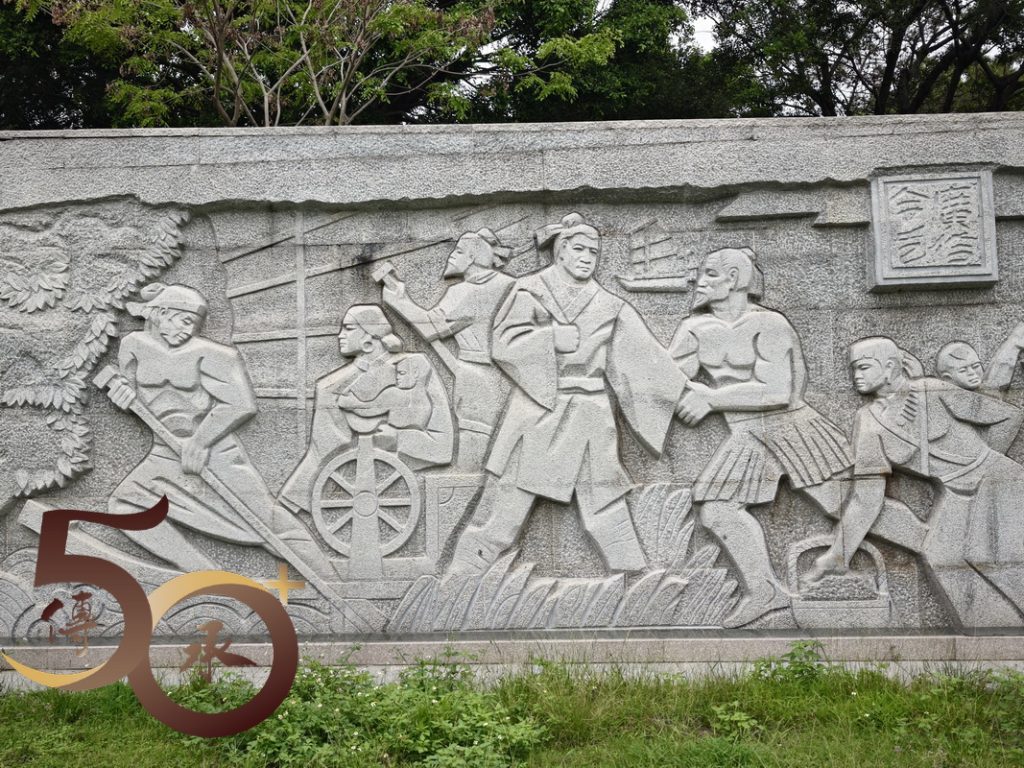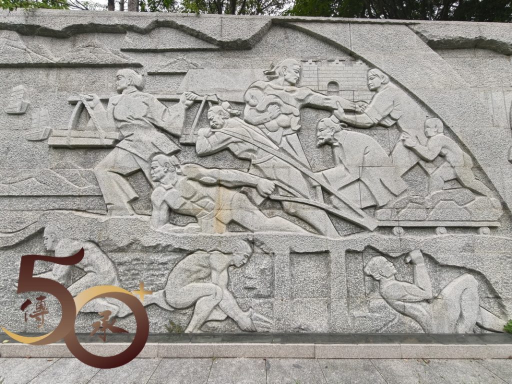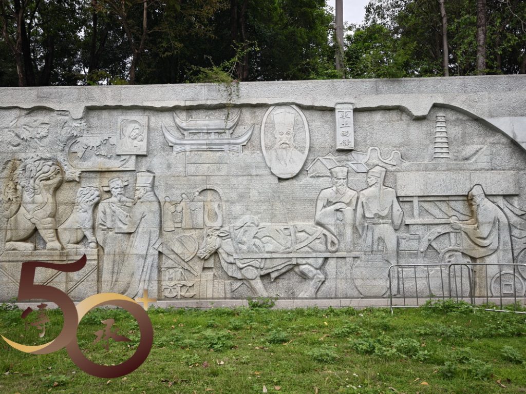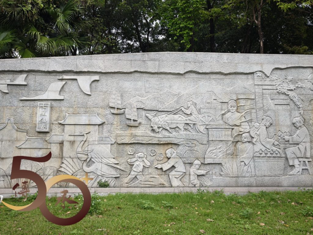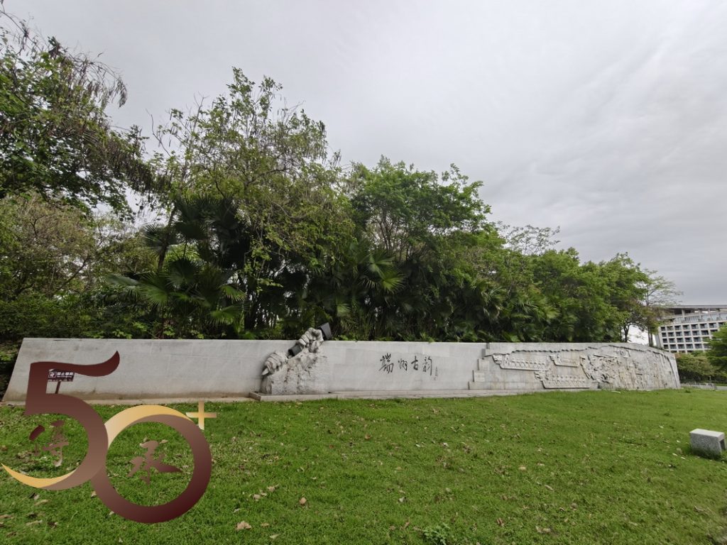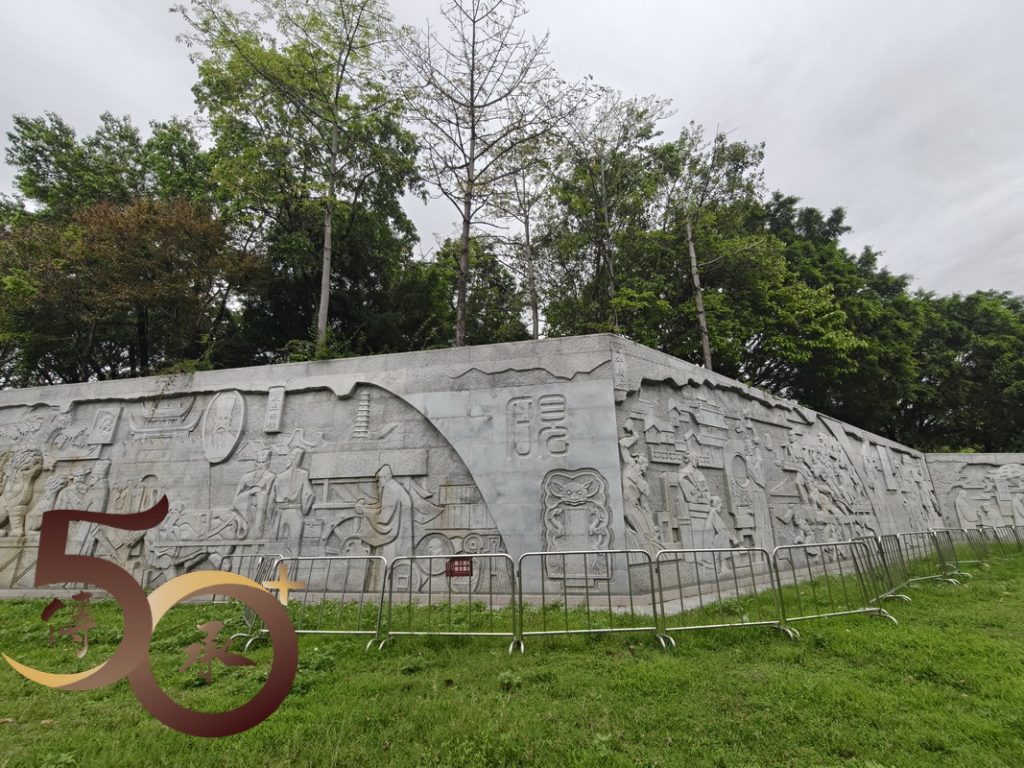 公車總站是牌坊公園,由東側進門首先看到著名雕塑家潘鶴和潘奮父子及陳克教授,花了四年時間雕製,長約193米,高約4米,如城牆般的「端州古韻」八個當地歷史故事。