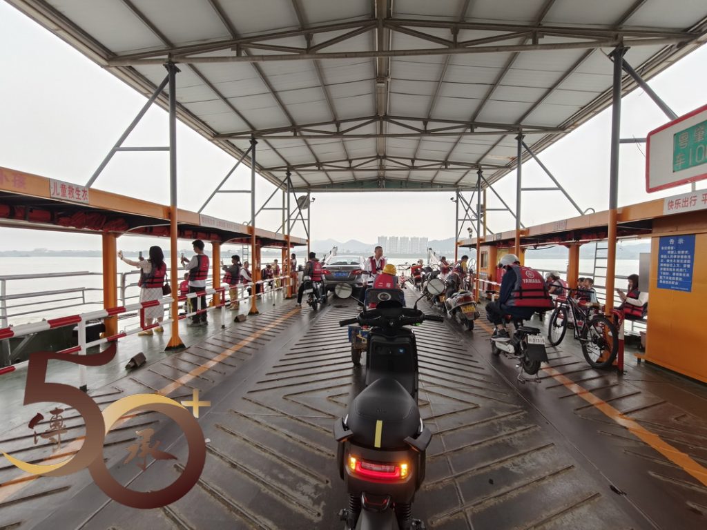 由金渡渡口到二塔渡口船程約10分鐘,一眾乘客卸下救生衣,騎上機車,待船頭的蓋板放下後,便陸續駕車「登岸」。由於回程船班是緊接的1030時(下一班為下午1530時),故只有約30分時間停留。