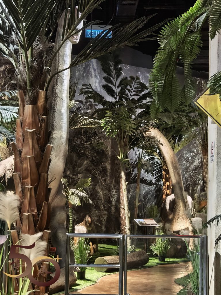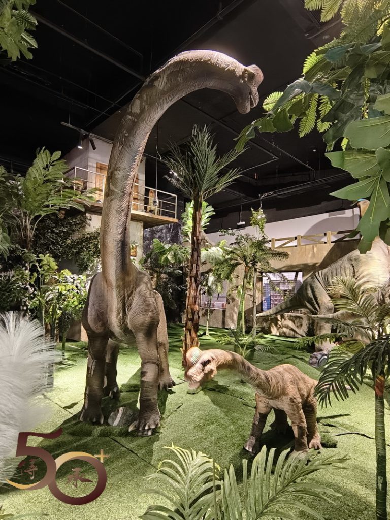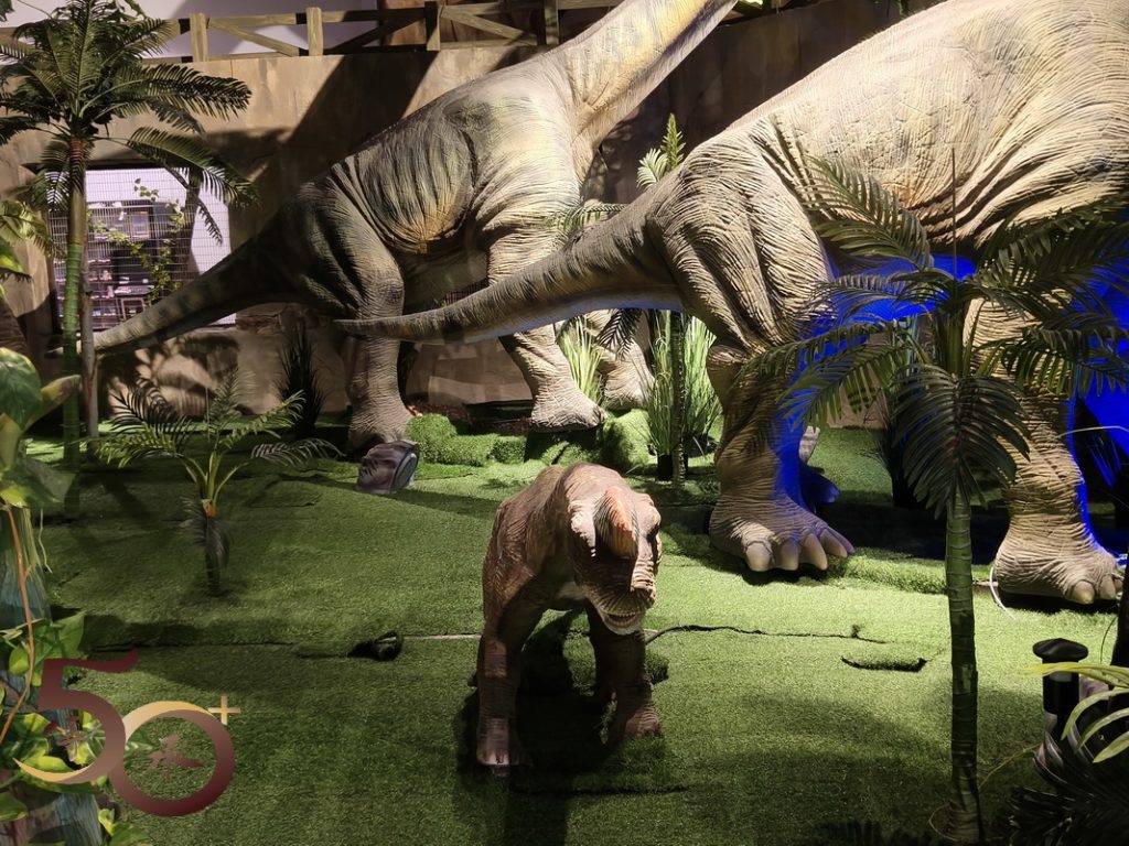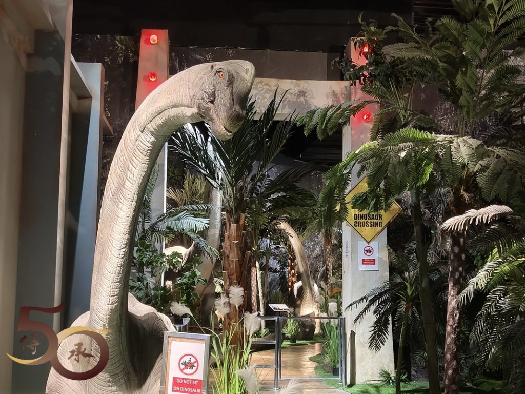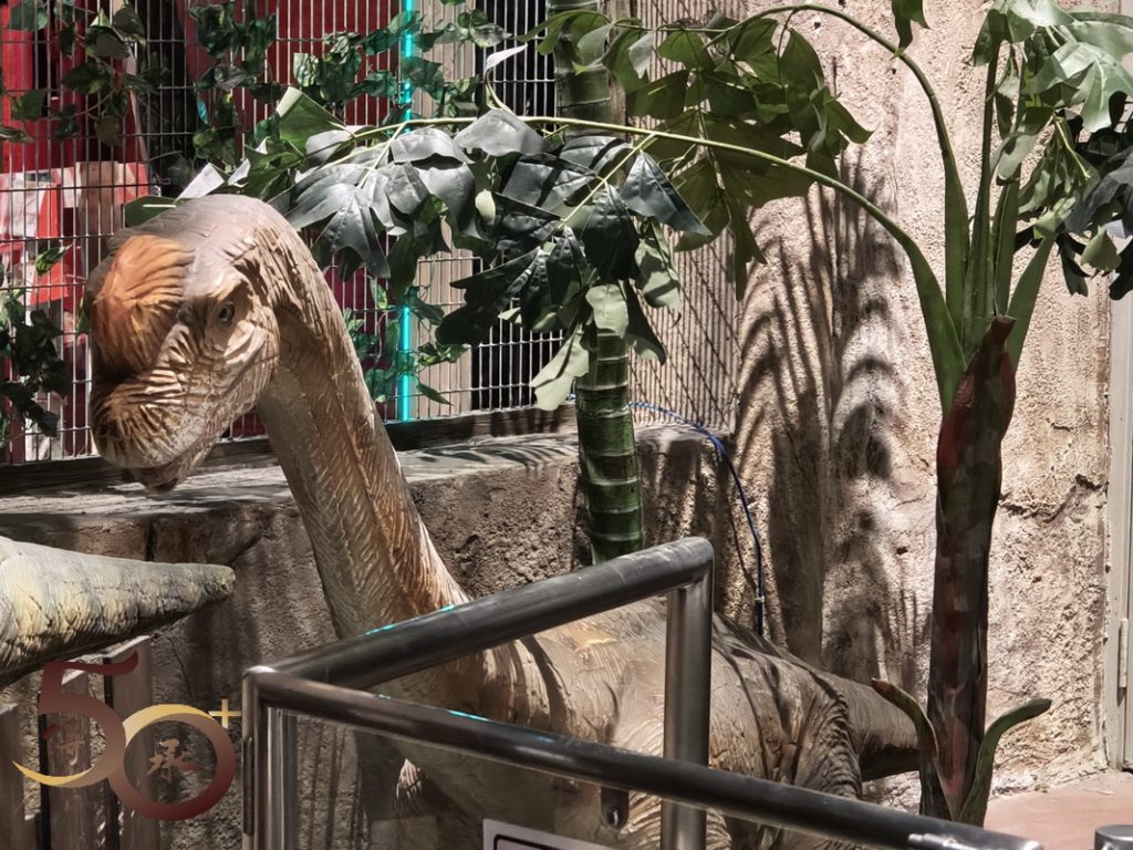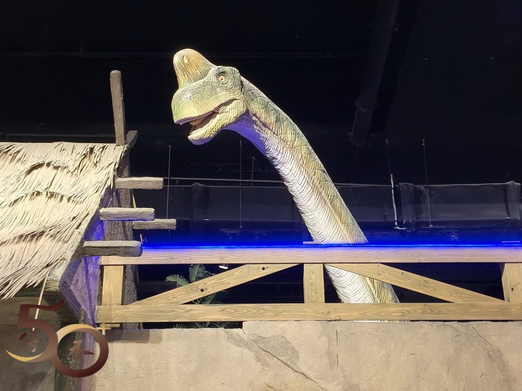 佔地不大的侏羅紀,與喪屍圍城的裝飾,迫真度遠遠不及電影的拍攝場地。在侏羅紀,門外已看到伸出巨頭的長頸龍,以吸引遊客入場,但觀之了了。再往前走,在另一端的出口處亦可看到原始森林下的不同恐龍,當中還有一隻十分可愛的小恐龍。