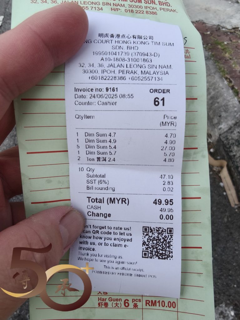各款點心的味道尚佳,有的冠以特別名字的餃子採用不同食材,亦頗為好吃。但有別於香港,以至內地的點心,「明閣」的點心偏向「嬌小身形」,一口便是一個,加上每籠點心約RM 4.7至5.7元,容易在不知不覺中吃得過多。最後與老伴共吃了9籠點心,計及「茶錢」為49.95元,約為香港價錢的一半,但卻是飽飽的,十分滿足。