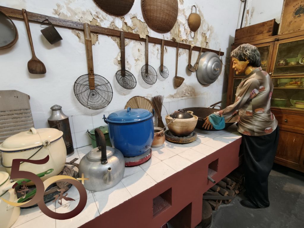 別墅一樓以還原大宅佈置為主,前方大堂中央放着一張可供十多人同時用餐的長型大枱,四周牆上掛着昔日礦工的照片、客家菜圖片,以及「閒真」的介紹。