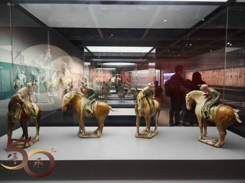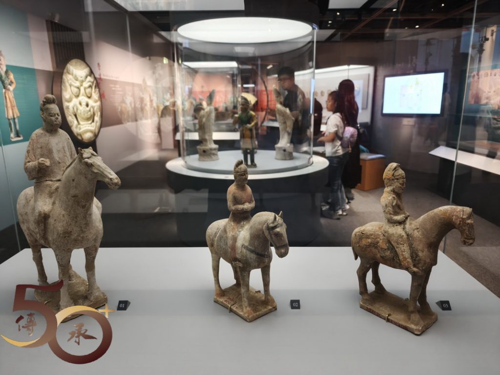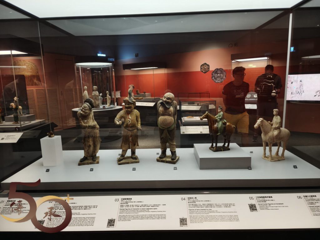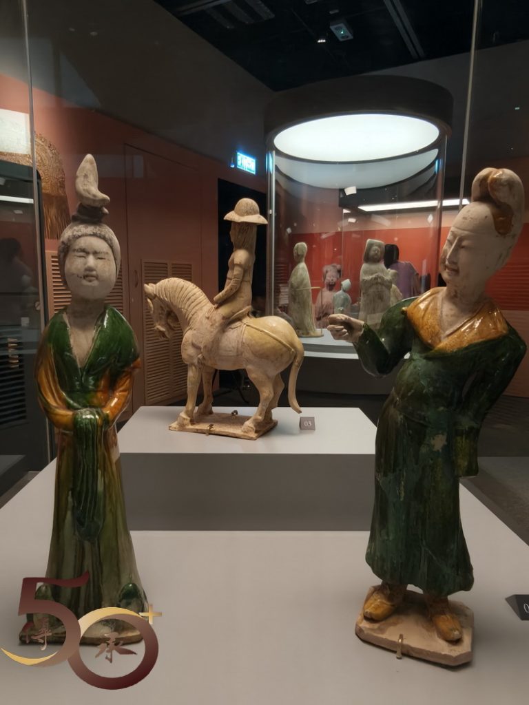 展出的展品包括一套四件,馬上女俑姿態活靈活現的「三彩打馬球俑」;反映貴族出行的「騎馬俑」;個人首次認識,作為進出皇城憑證的「魚符」;讓人驚嘆的「唐書•地理志」地圖上,有關廣府內中已有提到「南海」、「寶安」、「番禺」等地方名稱,以及「表情十足」的三彩樸帽牽馬俑。