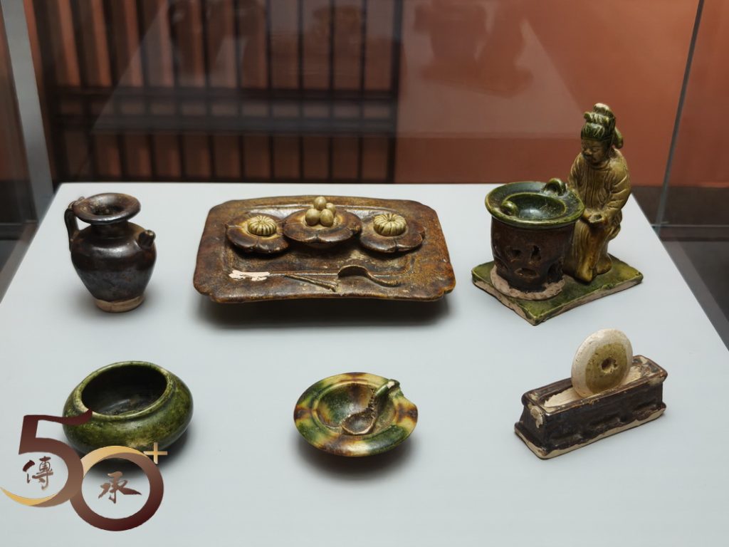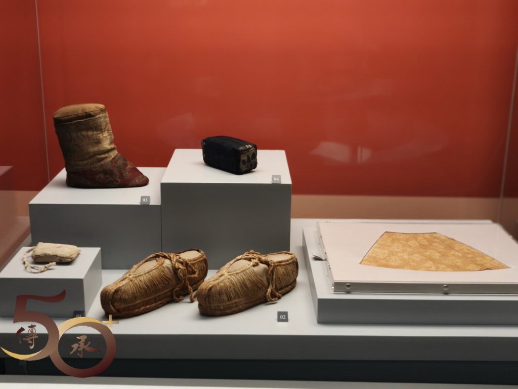 此外還有在河南墓穴出土,十分精巧別緻,代表唐代飲茶文化的「三彩茶具及坐俑模型」;展現唐代女性服飾特色的三彩單刀髻女俑和伶俑;吐魯番徵集的棉布袋、麻鞋、錦襪、方枕和小絹裙等起居用品。
