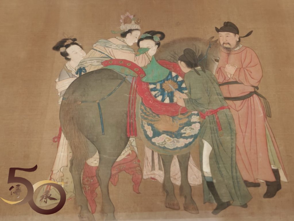 在「仇英(傳)摹周昉《真妃上馬圖卷》中,畫後有疑似後添的「仇英」款,而畫中的「唐明皇」目視着正在上馬的楊貴妃,畫筆精細之餘,亦可從旁邊的侍從手持弓箭,推測是準備前去狩獵。
