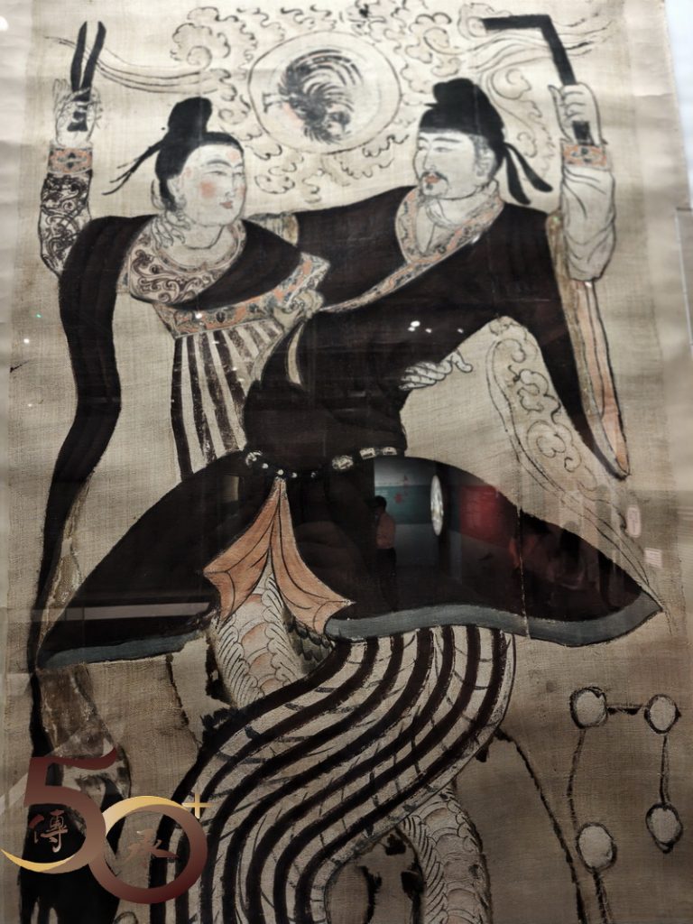 至於另一展出畫作,由三片原白色麻布縫合而成,人身蛇尾的《伏羲女媧圖》,上身相擁,下尾相交,則帶有「宗教」和「科幻」色彩,然而卻隱含濃厚的「中華文化傳統思想」。如「伏羲」執「矩」、女媧執「規」,「規矩」之意也!上方金雞代表太陽、玉兔、桂樹和蟾蜍則是月亮。