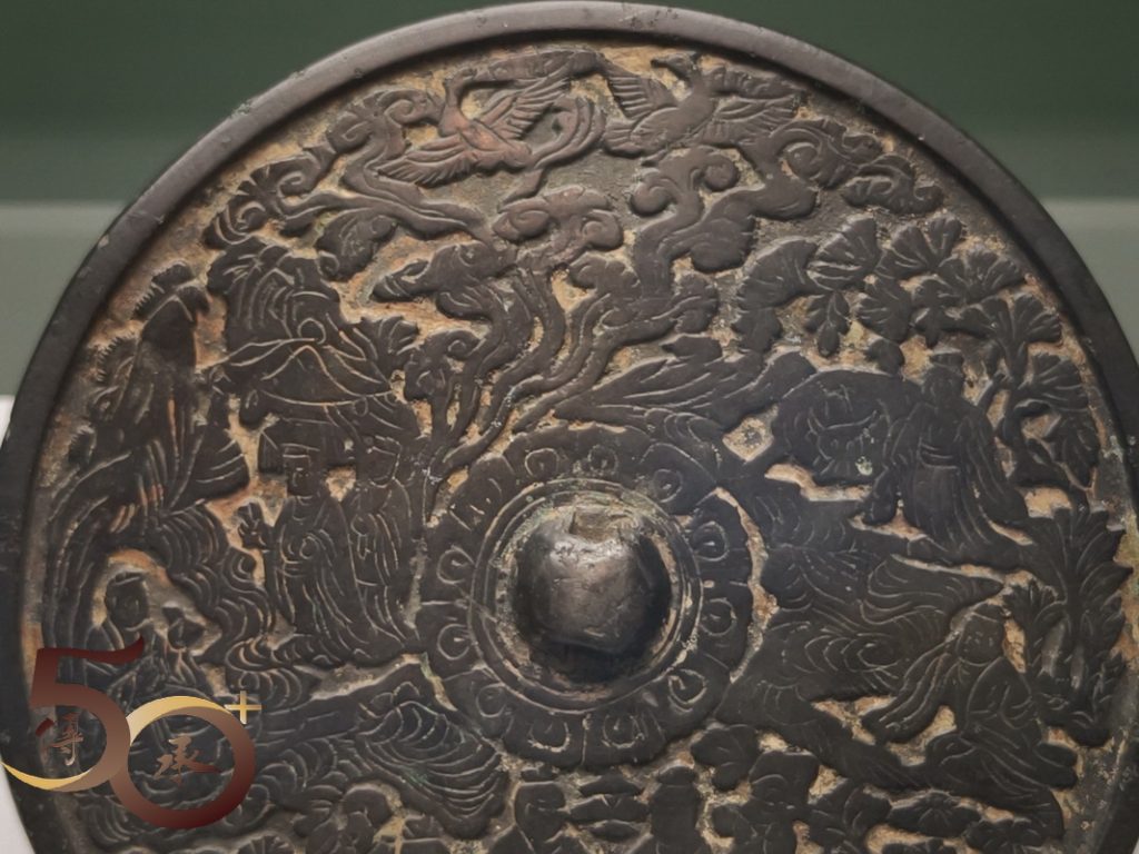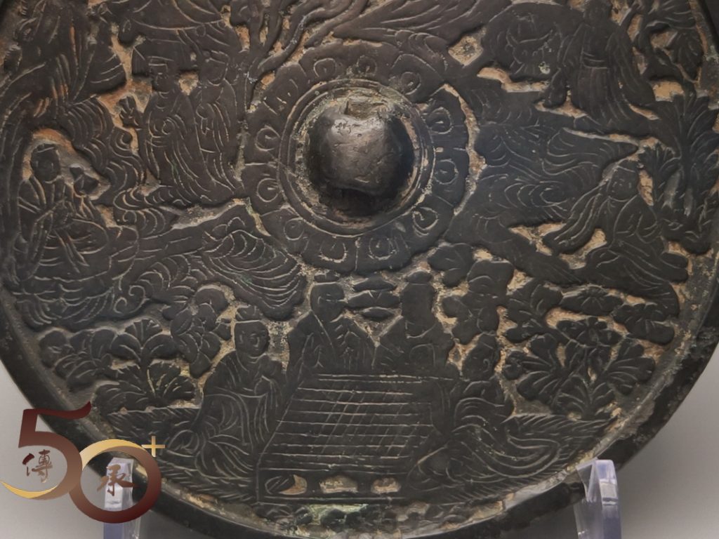 展品由「白釉辟雍硯」開始,其中「辟雍」源於漢代太學建築「環水」的特徵,並以白瓷為材質,有別於常見的墨硯;另一件展品「奕棋人物紋鏡」,在導賞員的悉心介紹下,才知悉「鏡背紋飾」竟是「減地平雕」(陽刻)工藝,刻上不同人物,其中以下方的四人下棋圖,營造出「以畫視之」的效果。