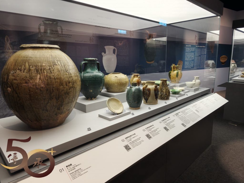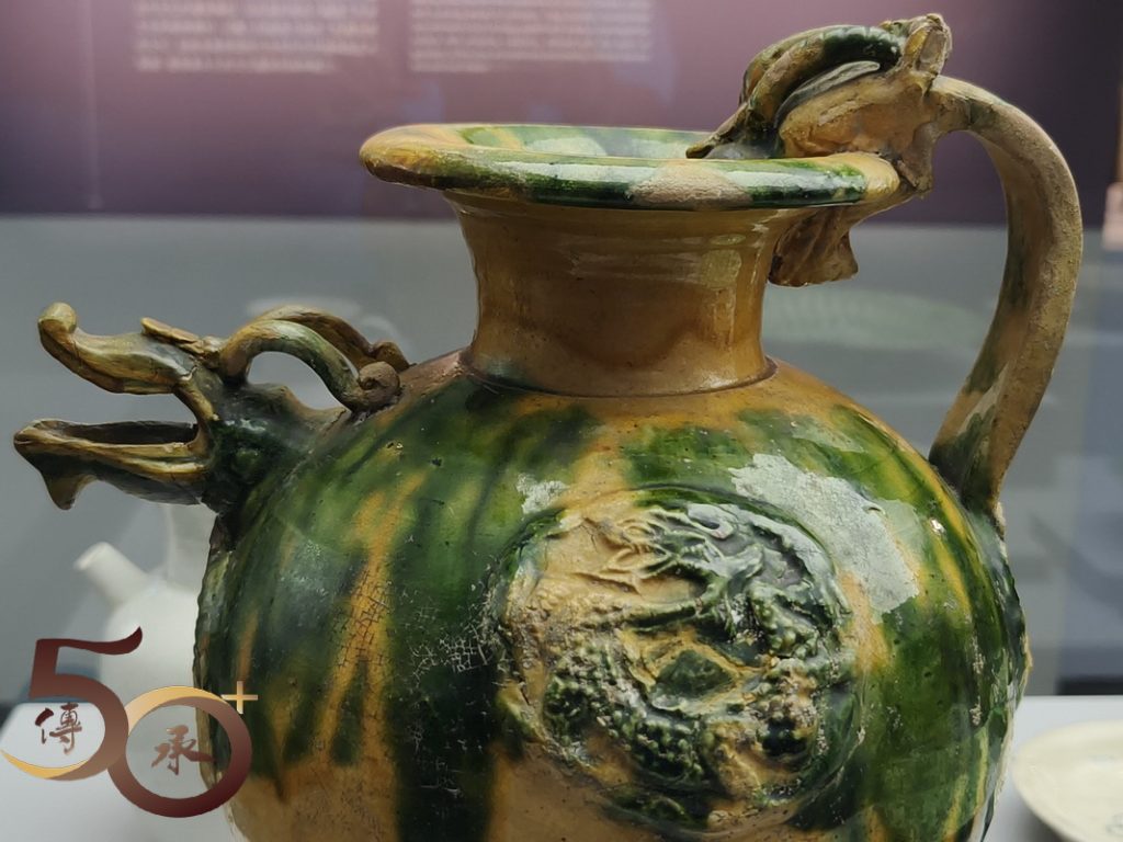 絲織品方面,展出包括「紅地聯珠對羊紋飾」織品外,還有其他如翼馬、孔雀等紋飾等製品。至於「綠地纏枝團巢鳳鳥紋飾半臂」短外衣,更是導賞員重點介紹的展品。最後的「揚帆出海」展出的唐代瓷器,不單是「瓷通四海」,更彰顯「長安城」是當時整個東亞文明的中心。