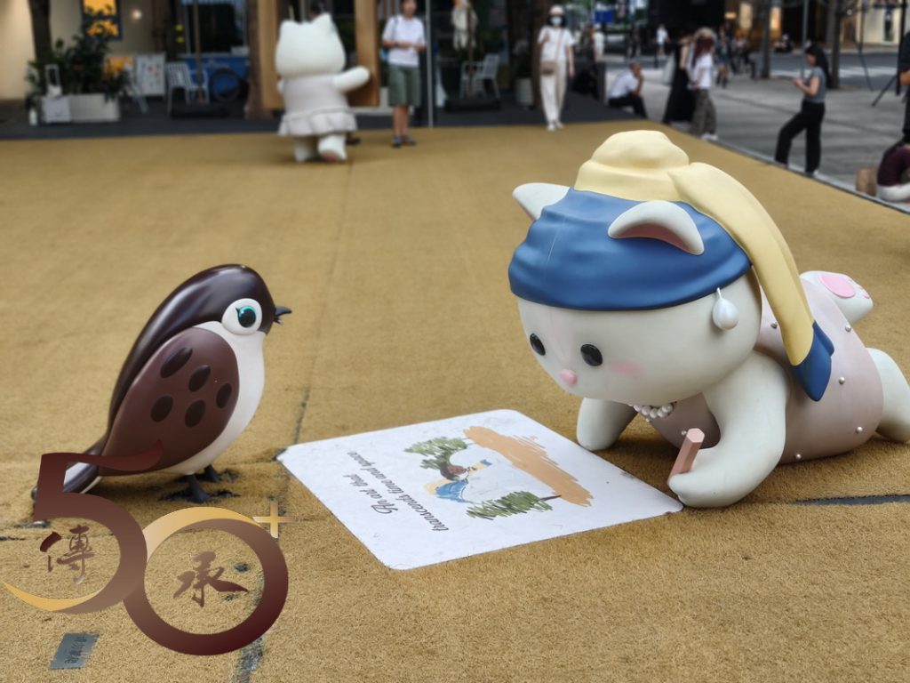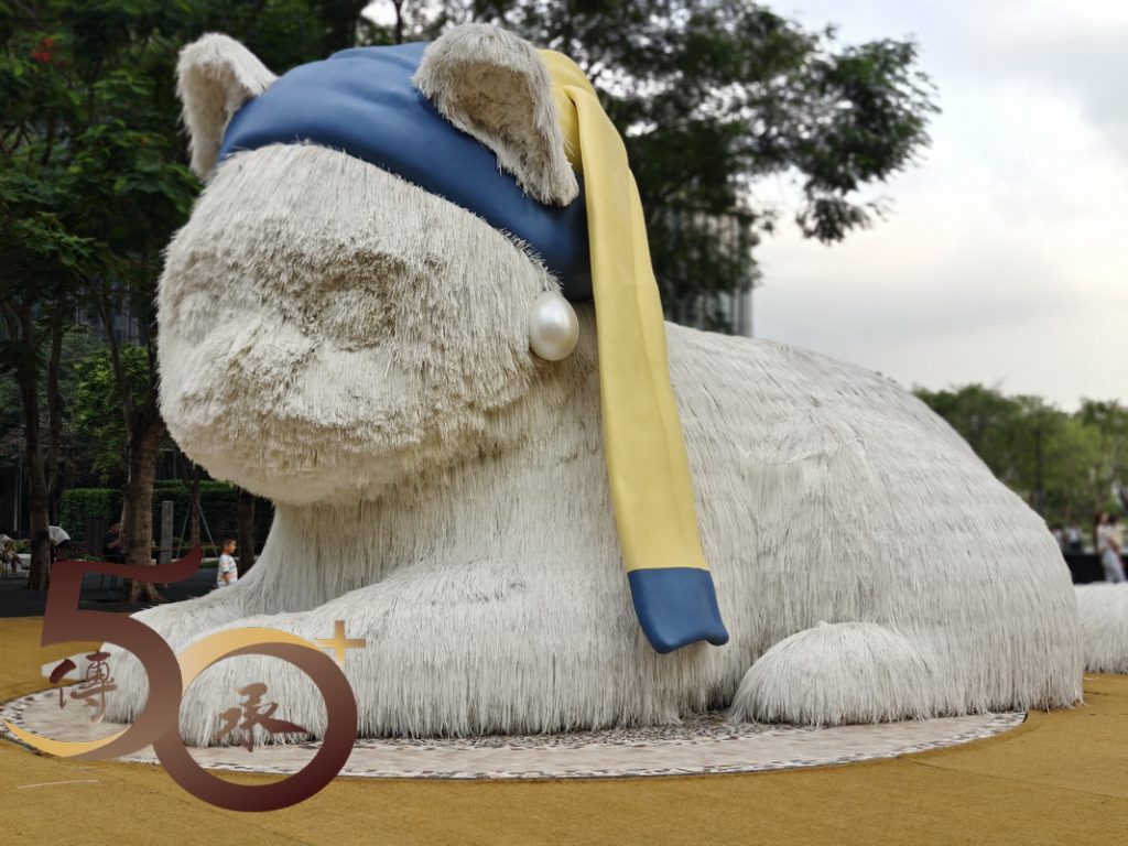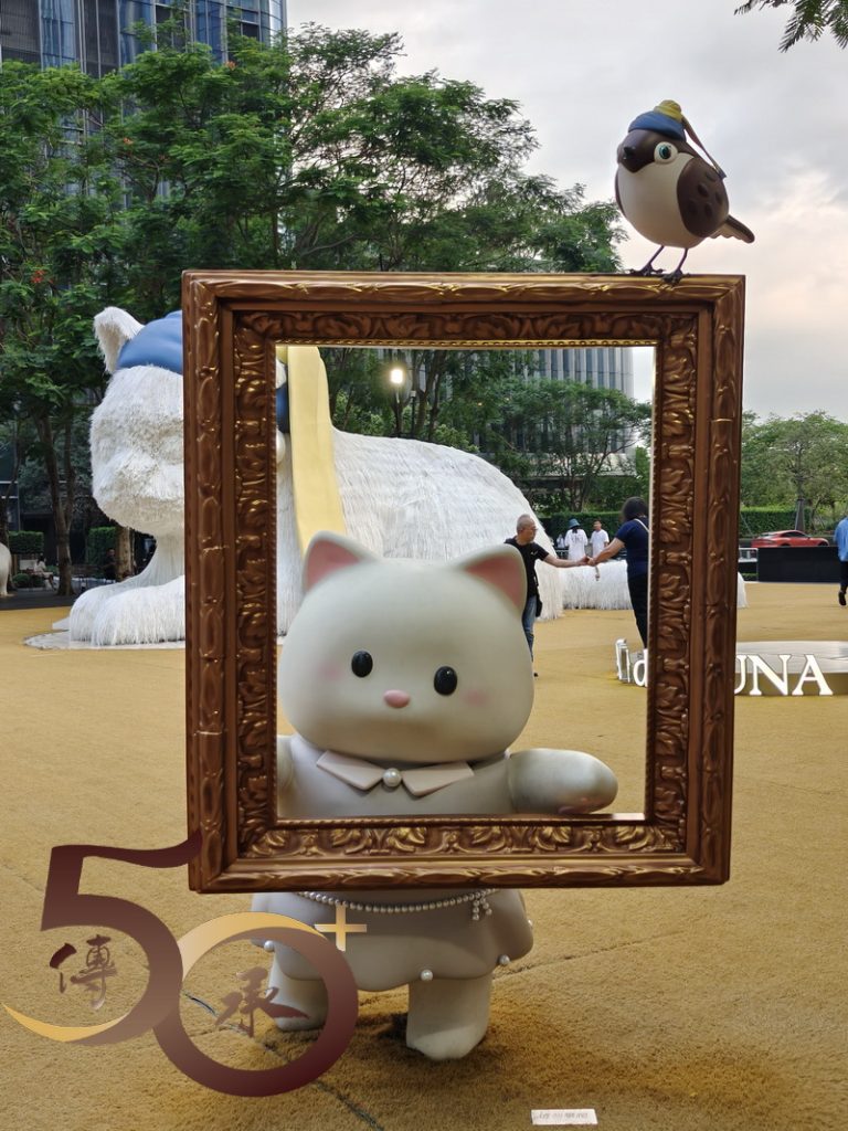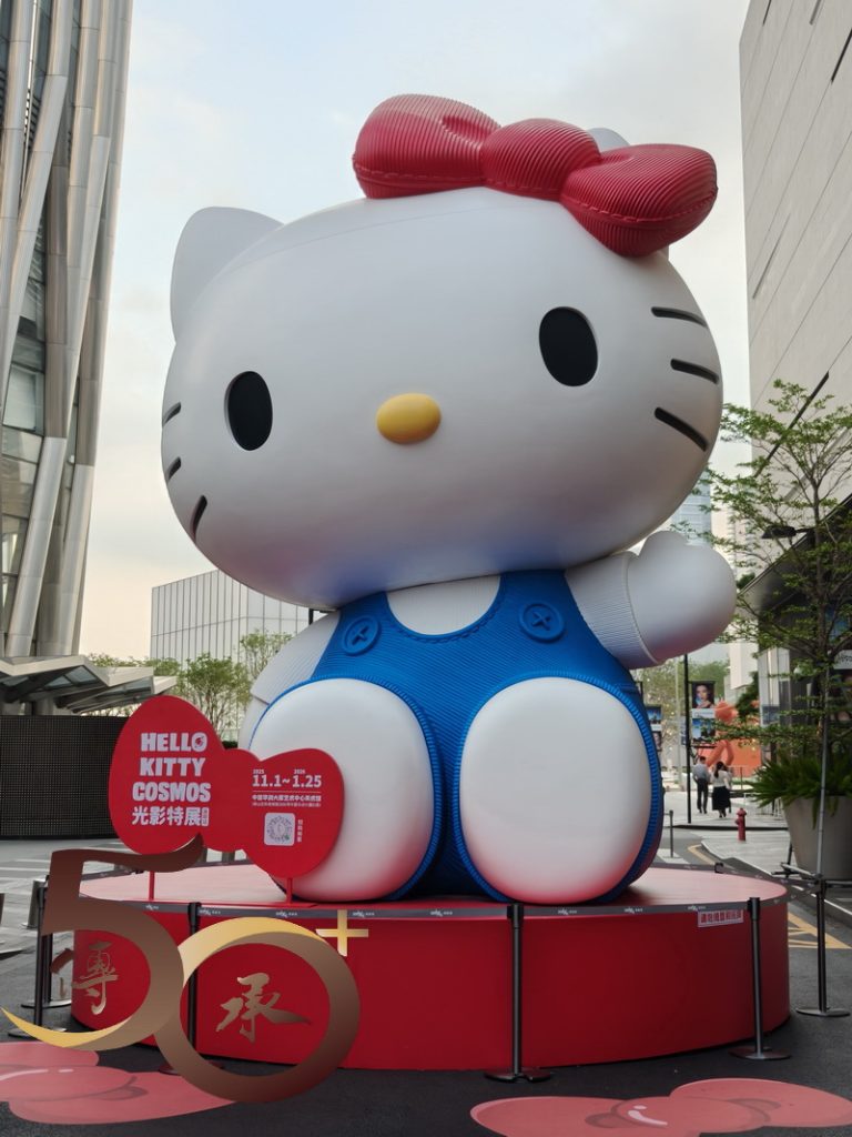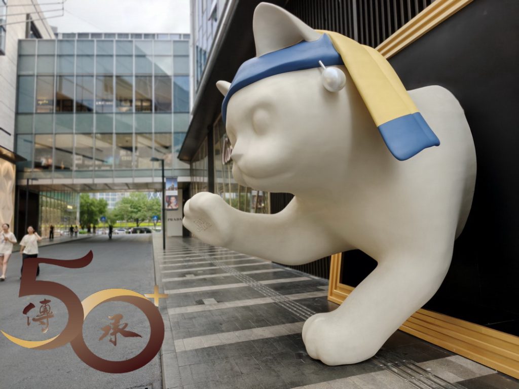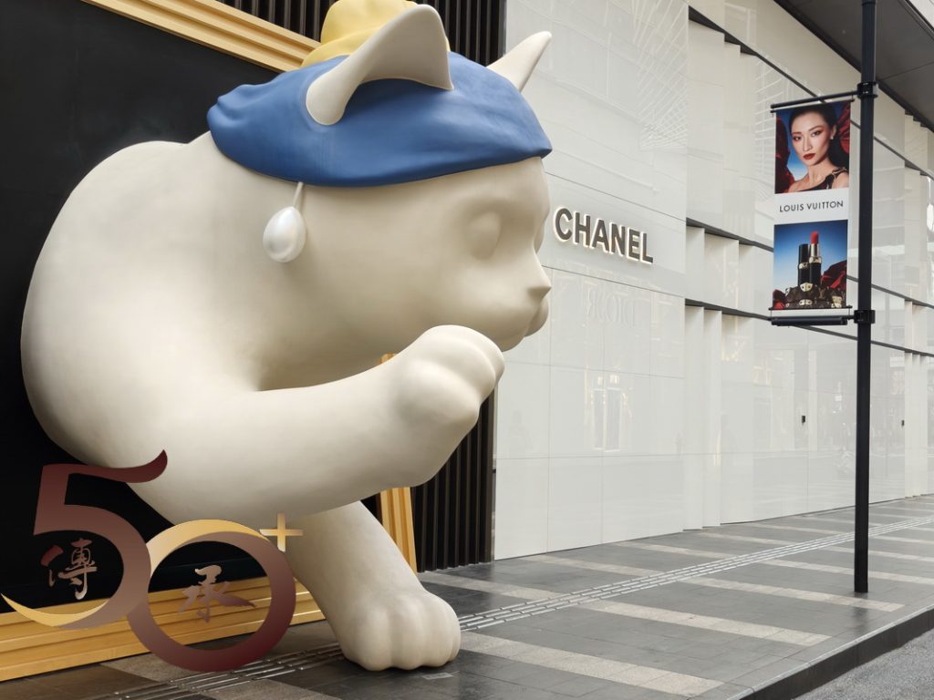 由地鐵站出來,深圳灣體育中心的「綠色」商品廣告雖頗為吸睛,但仍不及二期,標榜「灣區萬象藝術季」,其中一件位處逸景四路的「白貓」吸引。戴上藍色睡帽的小貓,仿如向路人招手般微微抬起右手,讓每位遊客都不期然停下腳步親近親近一下。