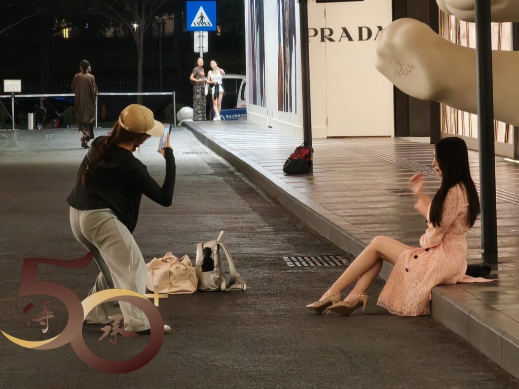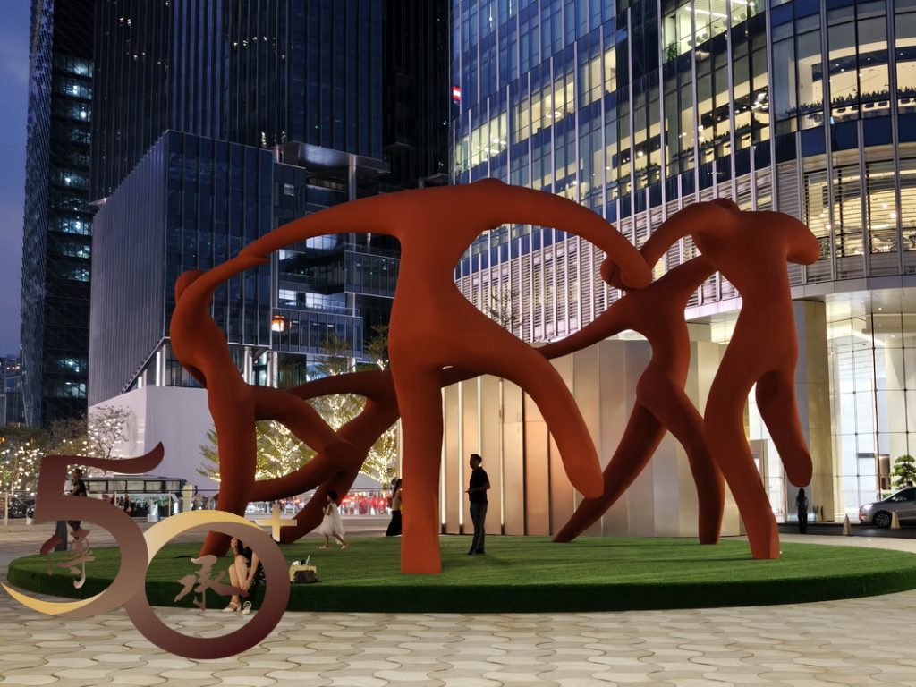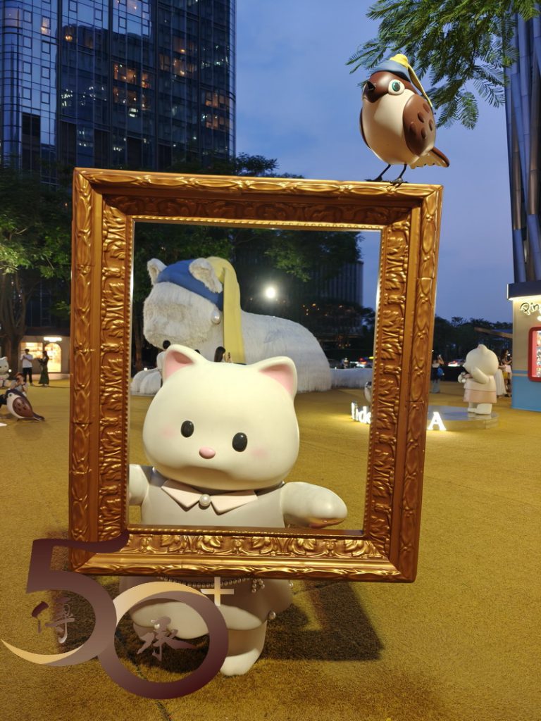 回到逸景四路,霓虹燈光下的「白貓」仍是「微笑」待人,十分可愛。至於春笋草坪中央蹲坐的「戴珍珠耳環的LUNA」,對身周人來人街的「龍友」置若罔聞,繼續在夜幕下安睡。