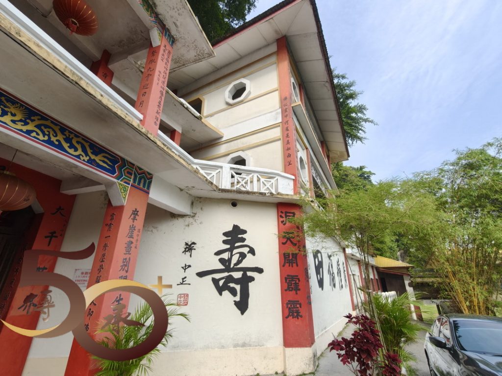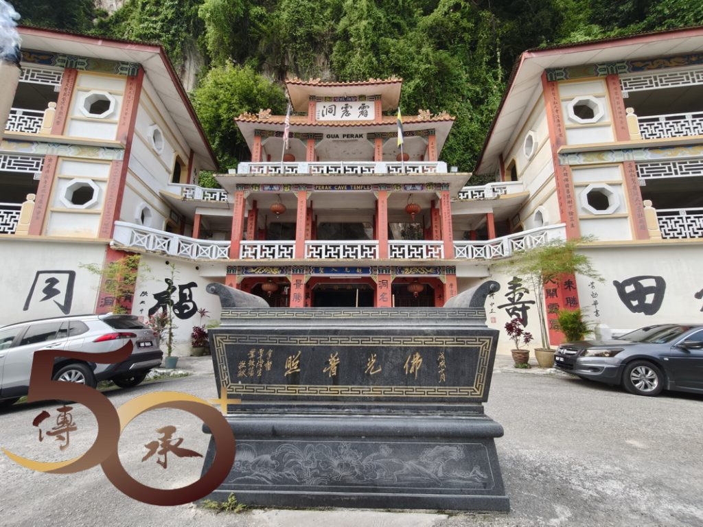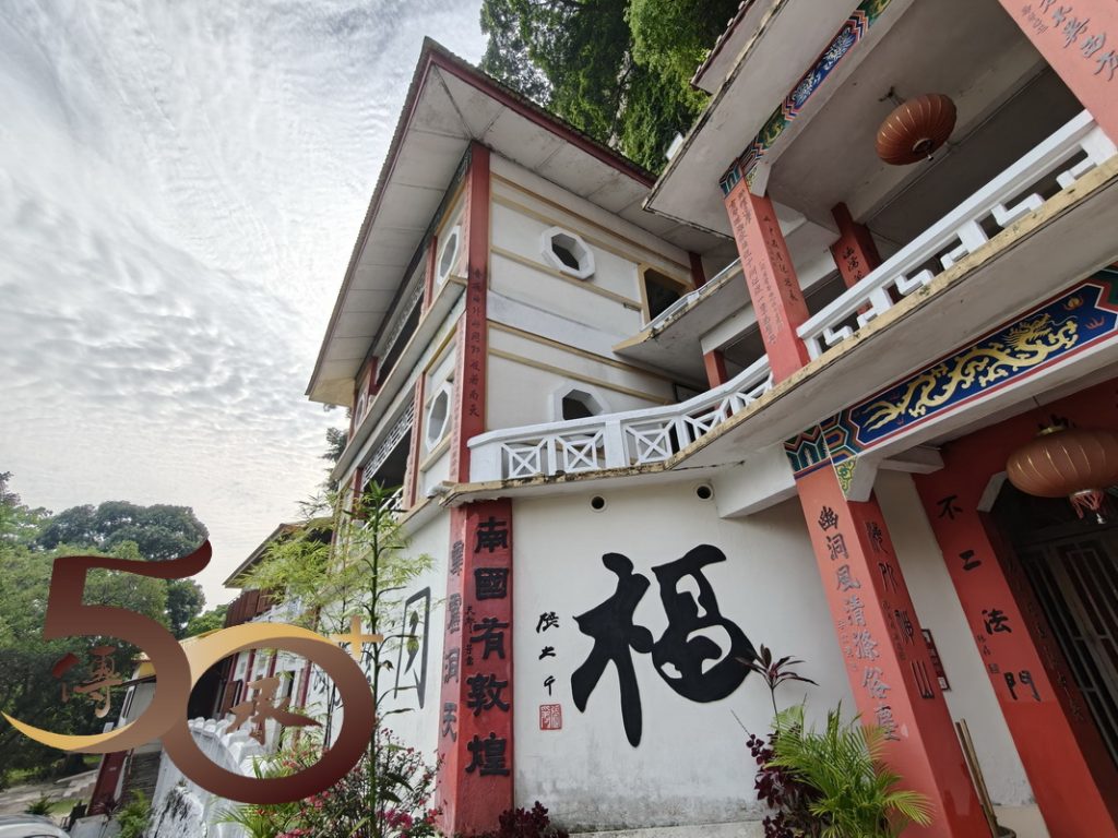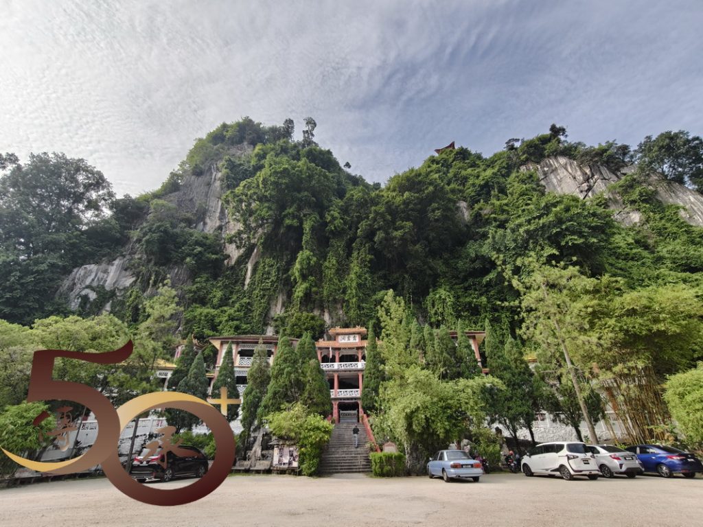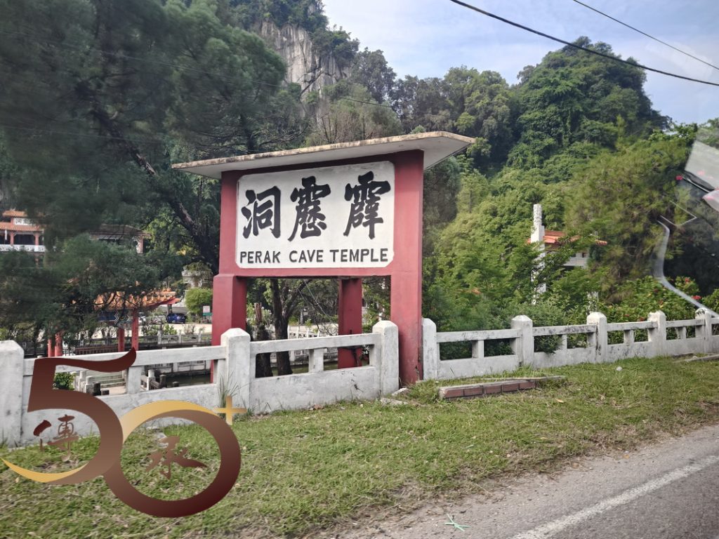 上午0945時回到霹靂洞前,紅白大樓屹立山崖前,門前牆上左是張大千的「福」,右是蔣中正的「壽」互相「對望」,別有一番「筆氣」,不遜於剛才在洞頂居高臨下遠眺怡保城效的景色。