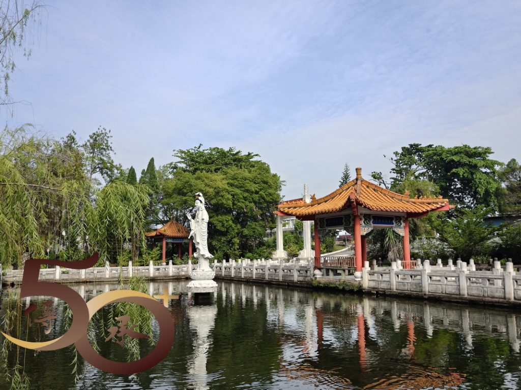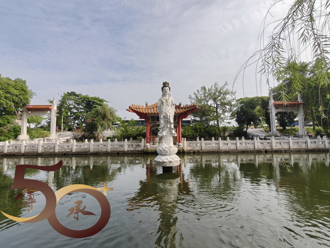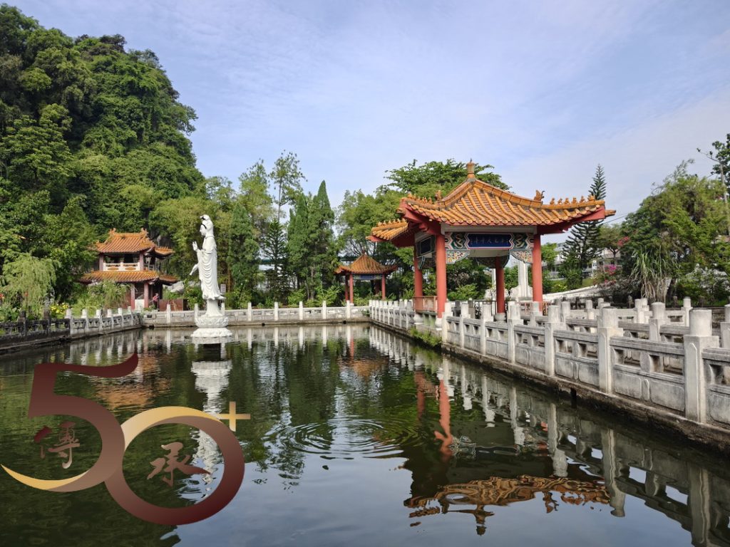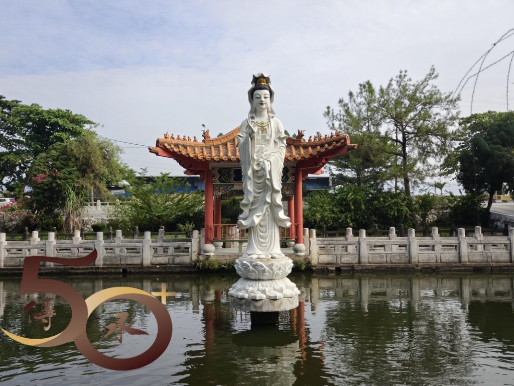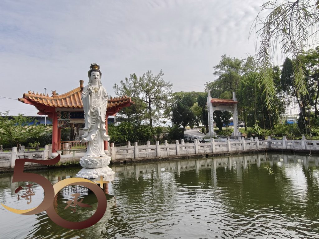 觀音池由呈長方形,四周種滿樹木,圍欄外則設有中式涼亭,清雅脫俗。在池水中央立着頭戴寶冠,佩戴瓔珞,手持淨瓶,腳踏蓮台的「白衣觀音」,神態安祥地看顧大地上的眾生。