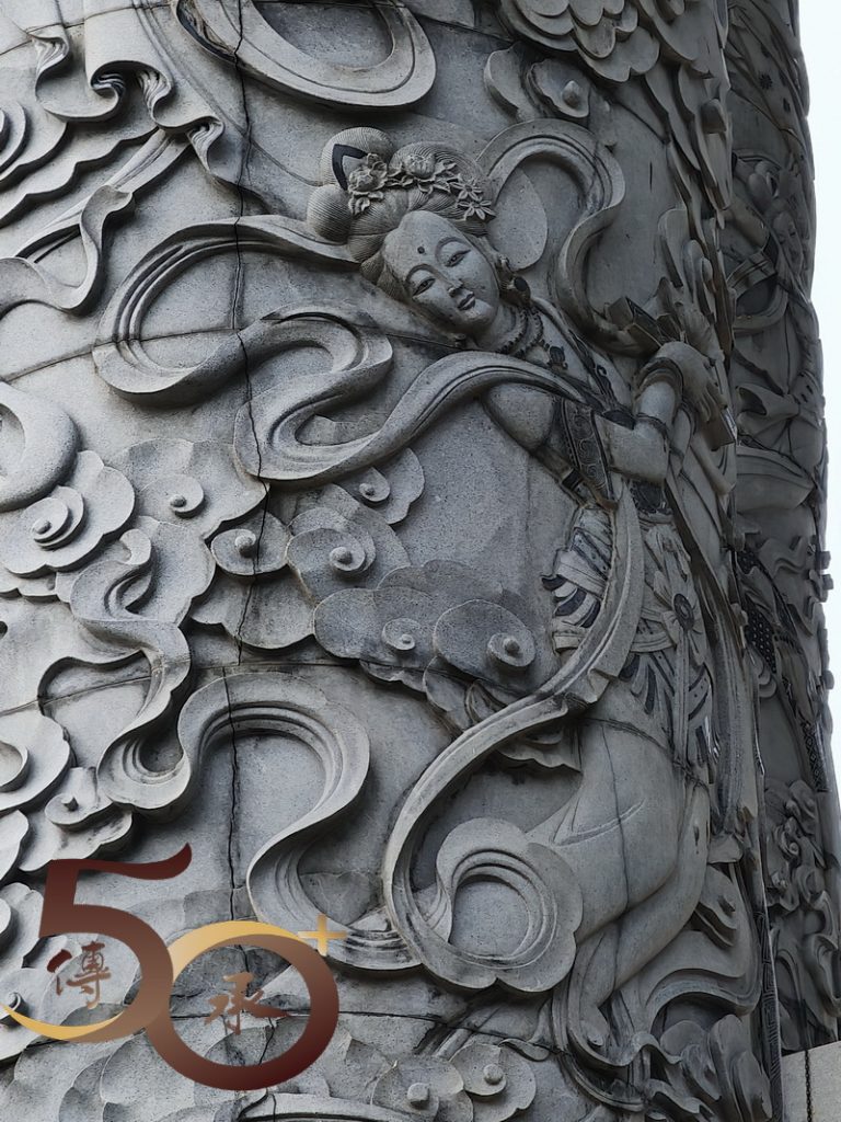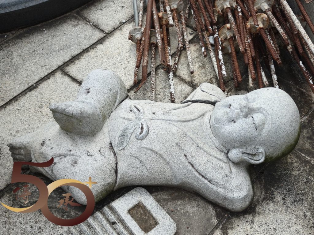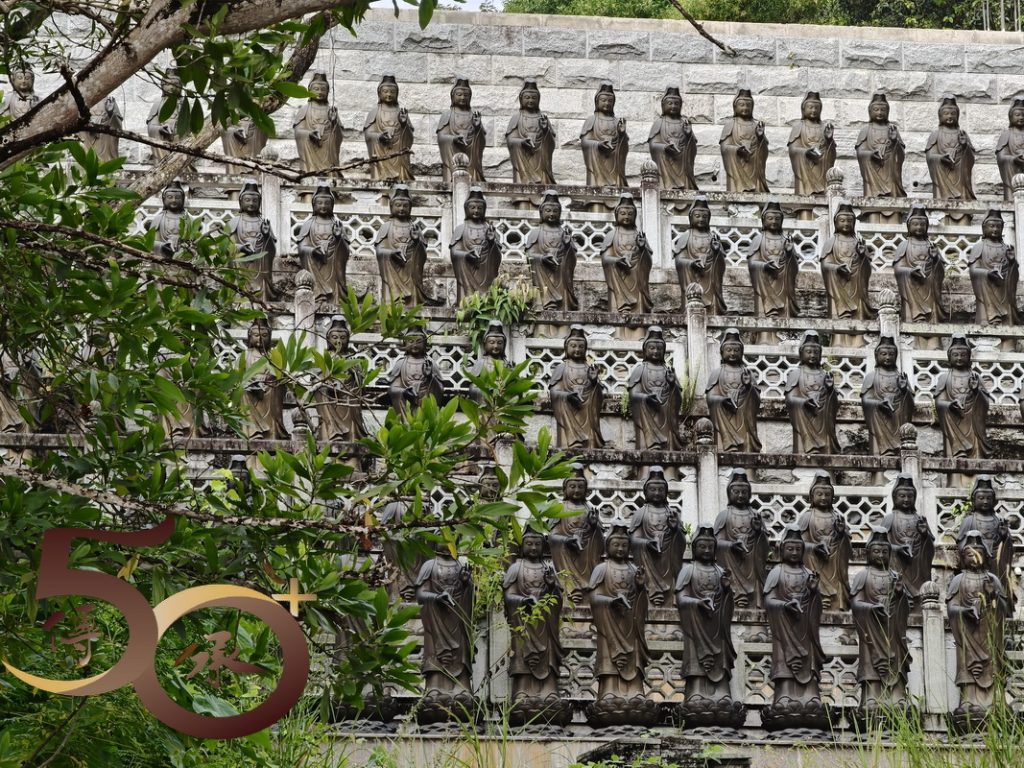 鶴山觀音像下方底座如一座城樓,城門上掛有「古佛垂慈形」橫額,與兩側的神樓全是雕刻手工精湛的圖騰紋飾,而在背後則由多個觀音像組成的觀音牆,加上地上暫放着的睡佛和瑞獸等,「佛味」甚濃。然而若回頭而望,一座只露出頭部的白衣觀音像,頰下卻緊貼着紅底金字,寫着早已結束的新春萬佛光明燈吉祥大法會的橫幅,彷彿是一幅如網紅發言人的「新潮」廣告,難免讓人感到有點怪怪的。