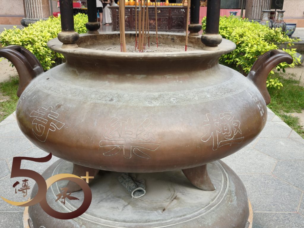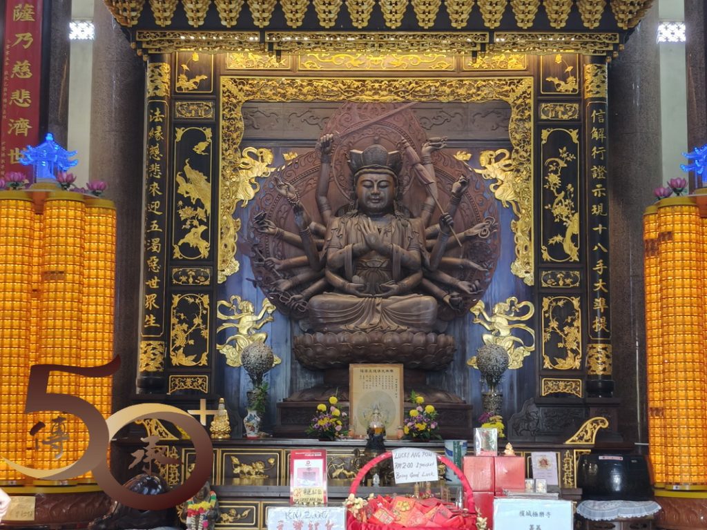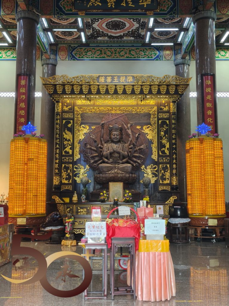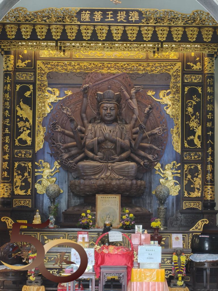 正門前鑄於2005年11月的巨型香爐,爐腳不見九龍之子的狻猊,而整個圓形的爐身卻有點像紫砂茶壼。進廟可見「千手」準提王菩薩居中而坐,神態安詳,而以中國傳統卯構建,層層疊疊,十分精美的圓形屋頂,卻隱身在保護絲網中,難以拍出其美。