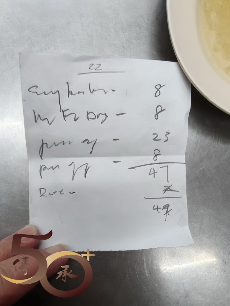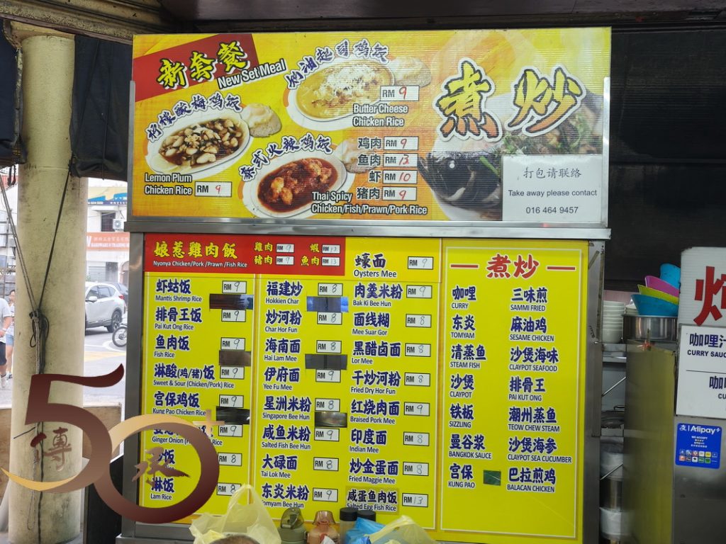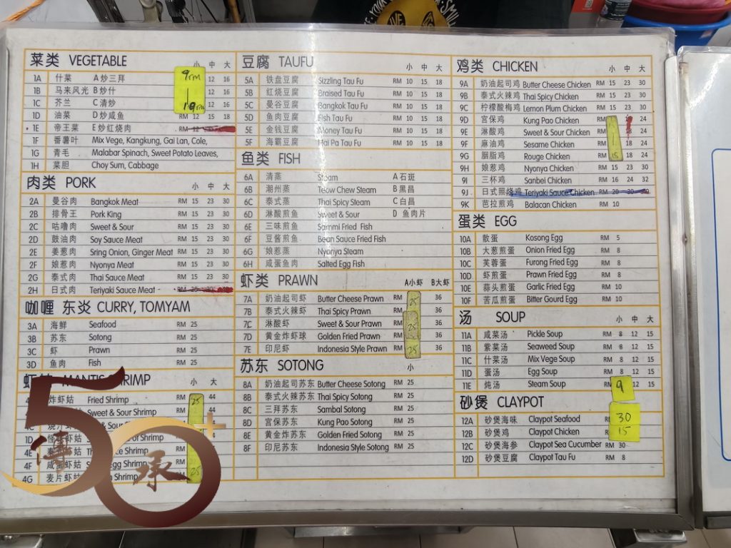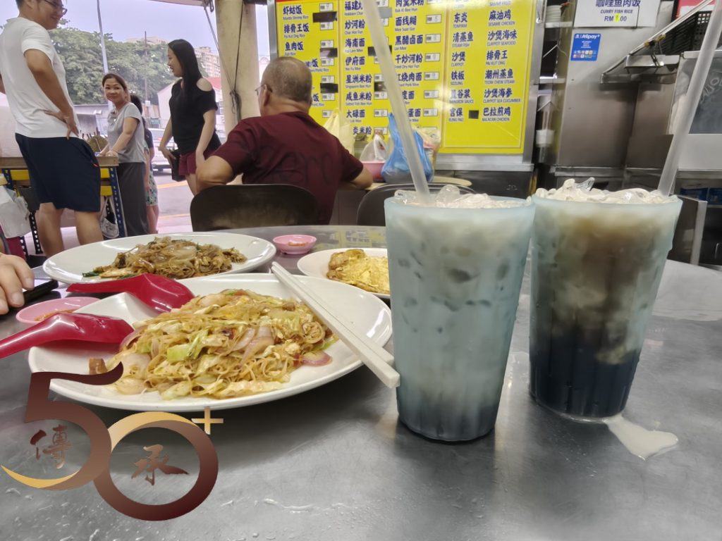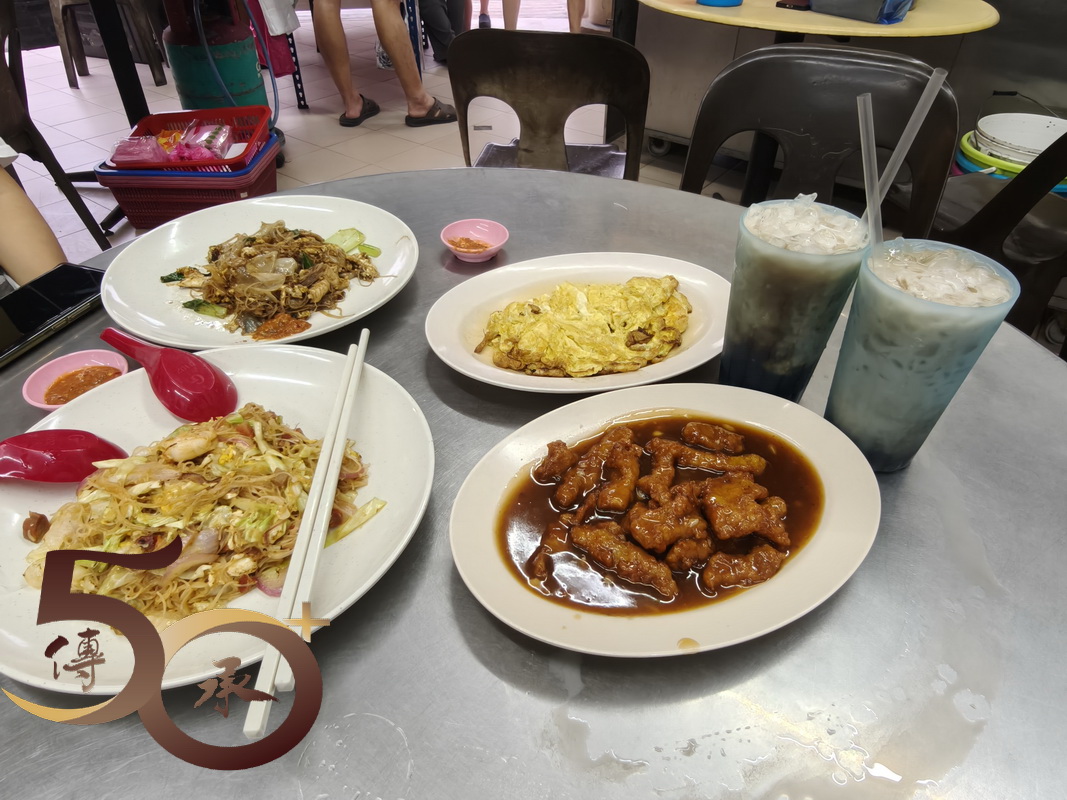 茶室有巨型中文餐牌,點餐十分容易,分別叫了炒河粉(RM 8元)、星洲米(RM 8元)、芙蓉蛋(RM 8元)和排骨王(中,RM23元),共銀RM 49元),而兩杯飲品另付。