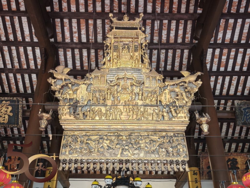 由正門進廟,經過右側繪有「魯班故事和工具」的小草地,硬山頂上的正脊脊飾雖較為簡單,惟夔龍紋飾在正脊,垂脊均有,形態十分生動。正門香爐後方的橫額,金色的魯班古廟四個大字十分「醒神」,而構建的隔架、駝峰和雀替都以金色為主色,壯嚴下盡顯華貴。