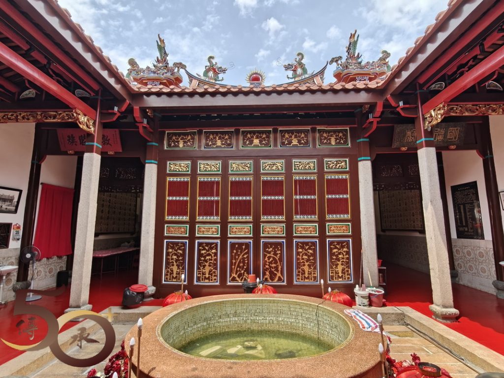 陳公祠的建築風格融合了中式傳統寺廟和東南亞地區的特色,兩進三間的主樓前設有宏偉的牌樓,雕梁畫棟、金匾高掛的前後進均為神樓,供奉陳氏歷代祖先神位,中間為「四水歸堂」的天井,並置有圓形水池,仿如一個小花園。