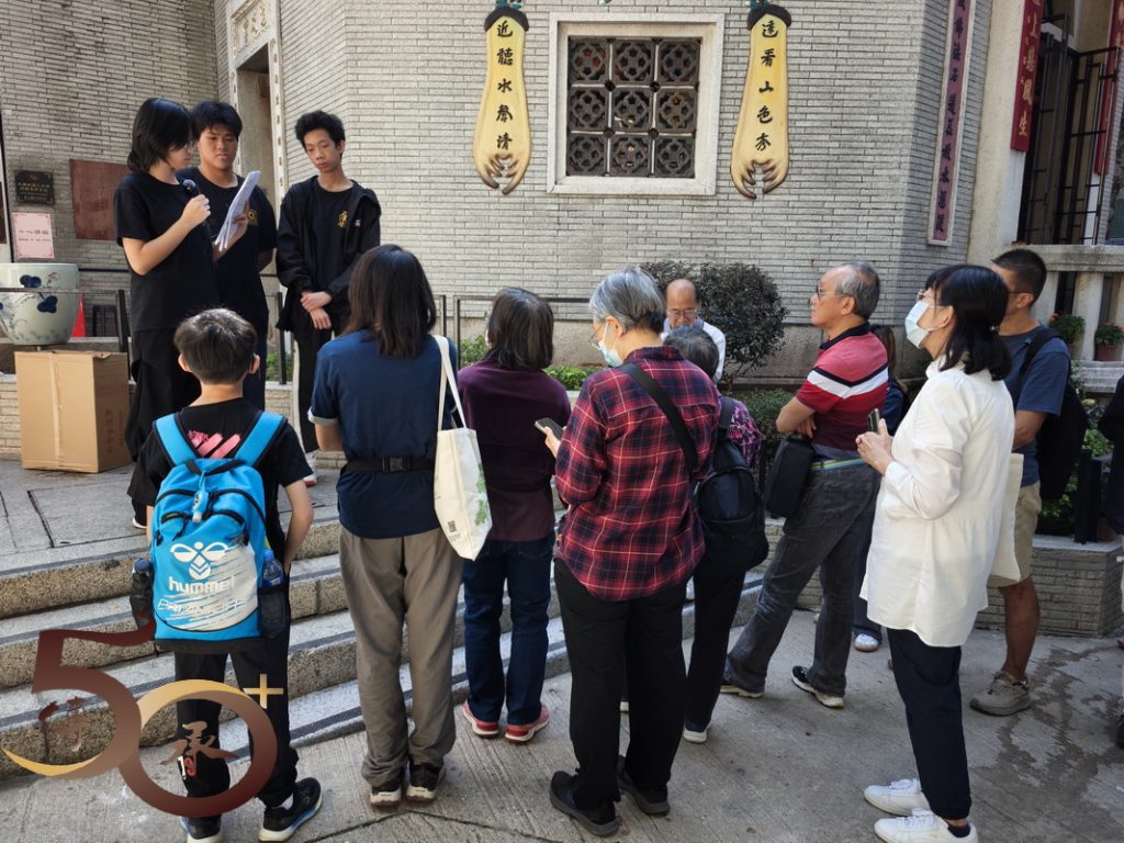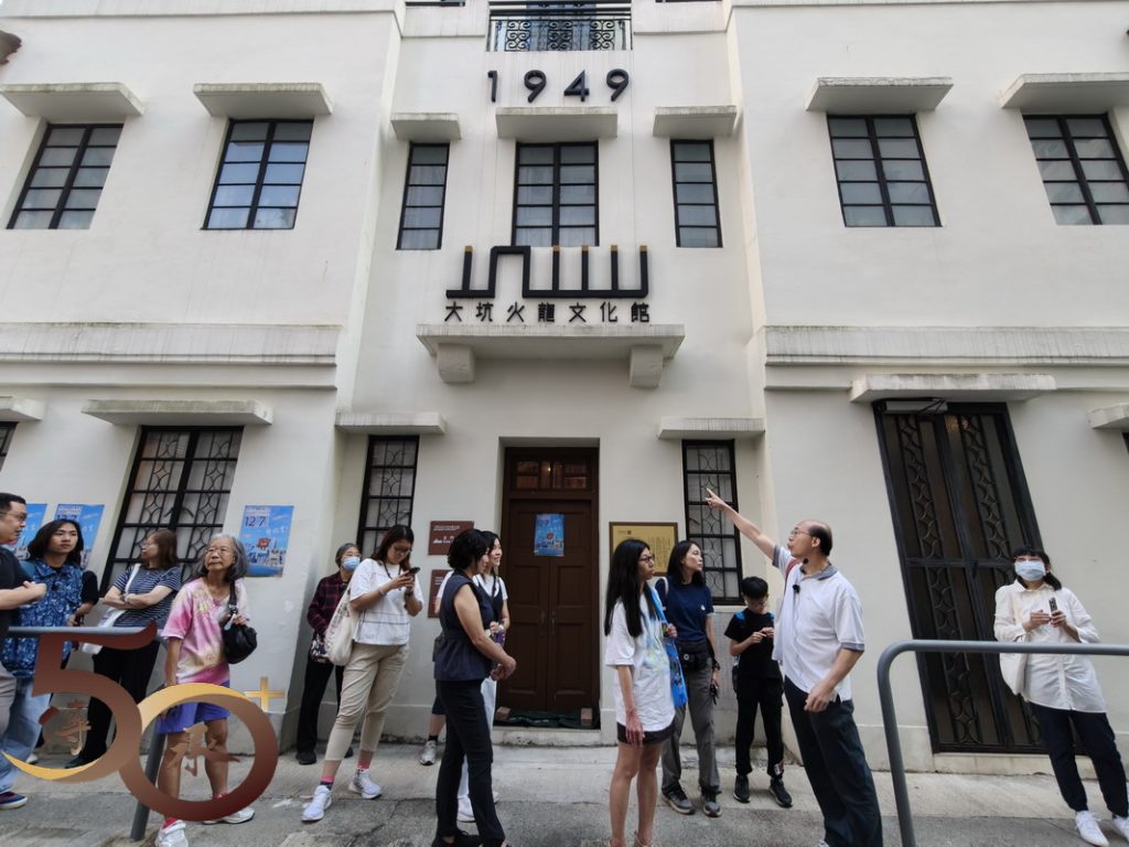 談到大坑蓮花宮,當然離不開2011獲列入國家級非物質文化遺產的大坑舞火龍,鄒老師更是協助傳承人「輝哥」一起申辦的幕後「能手」,故對開光儀式等傳統知之甚詳,並與一眾參加者分享。最後,鄒老師帶領來到建於1949年,曾是孔聖義學的大坑火龍文化館門前,介紹建築物活化的歷史,以及《重建題記》石碑上,曾任大坑坊眾福利會理事長的球王李惠堂的撰文。