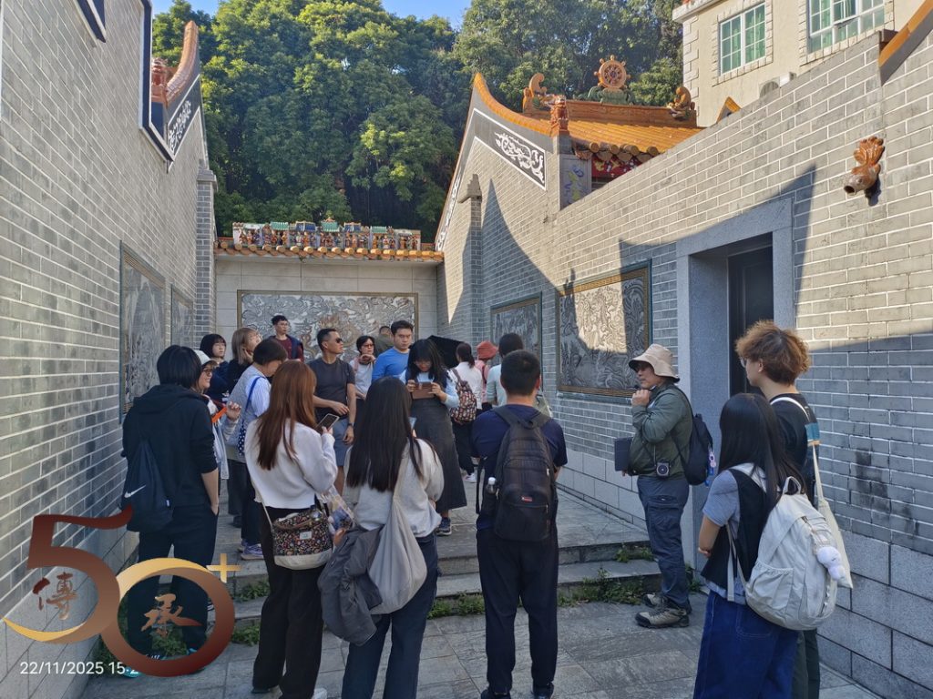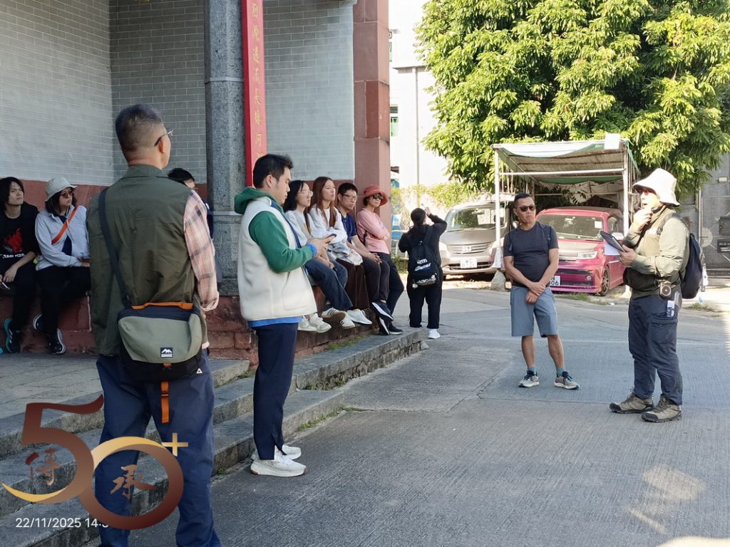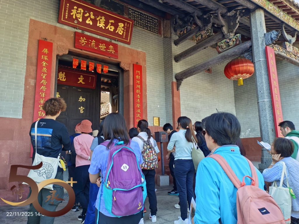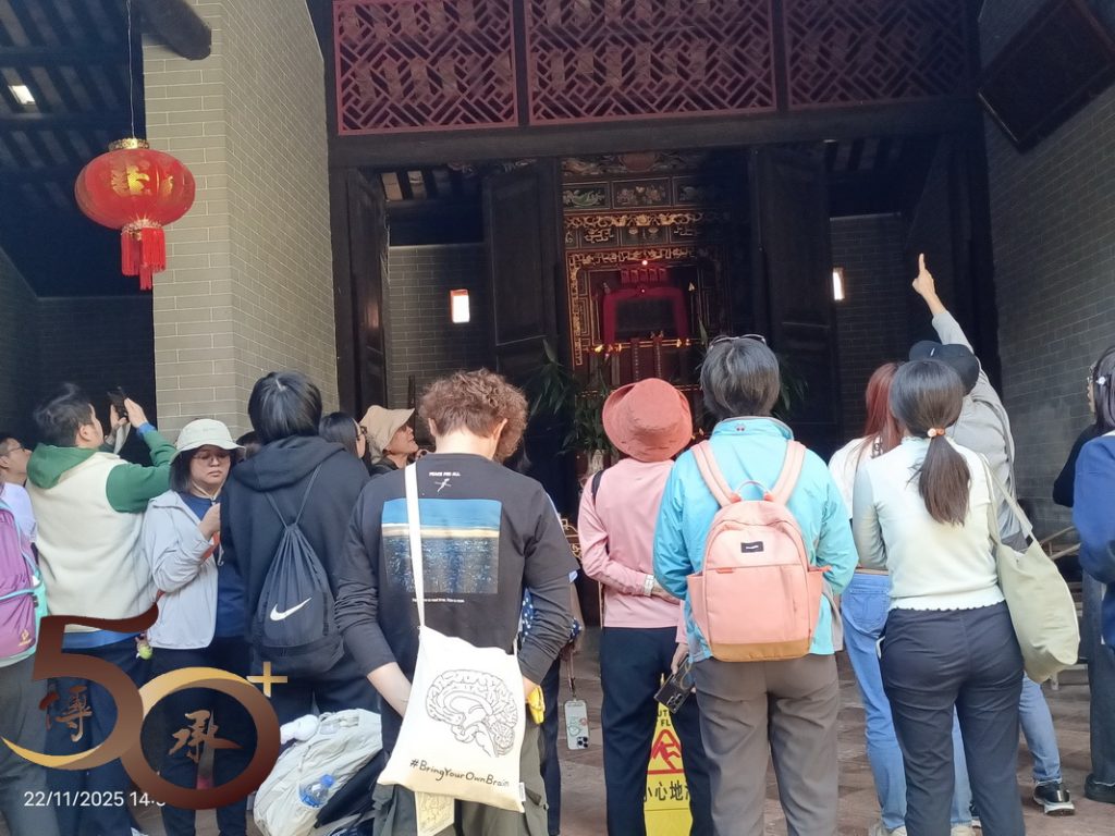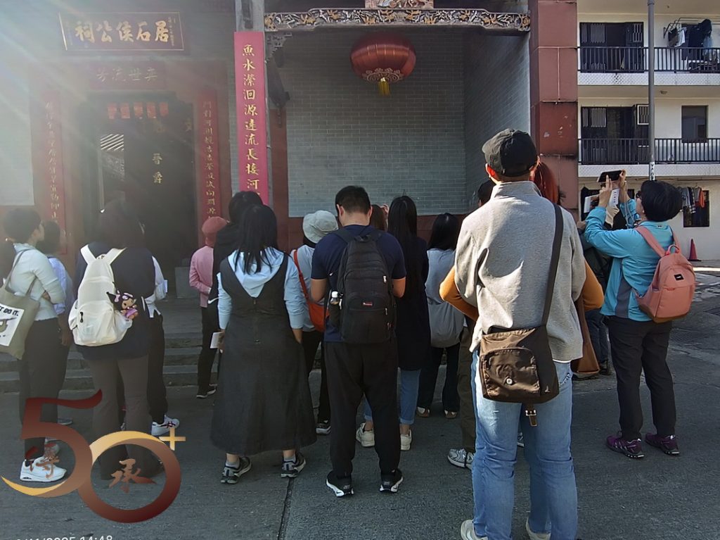 待至下午1410時,較原定集合時間逾10分鐘後,木蒔導賞最後一名工作人員離開,剛好趕上準備開出的小巴,經過10多分鐘車程,抵達河上鄉「地標」,屬法定古蹟居石侯公祠,導賞活動亦隨即展開。