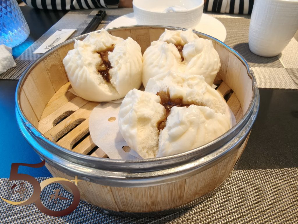 接着送來叉燒包,餡料味道不錯,只是包身外層有點乾,口感較差。第三道菜是蒜香南瓜排骨,未至香味已至,吃來熱呼呼的排骨已好吃,沾滿肉汁的南瓜更佳,讚。