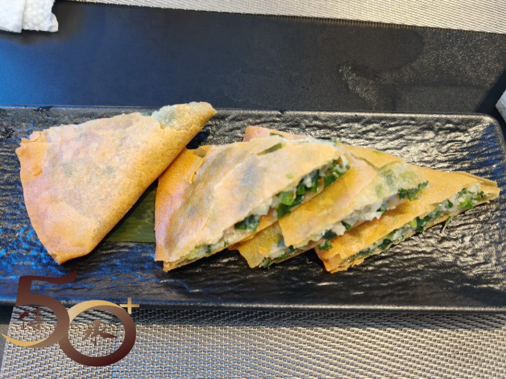 青芥焗紫菜卷改為蝦餅,啡色的外皮展露綠色的九菜,其貌不揚。殊不知入口外皮香脆,配合內裏的九菜蝦蓉粒,口感有驚喜。