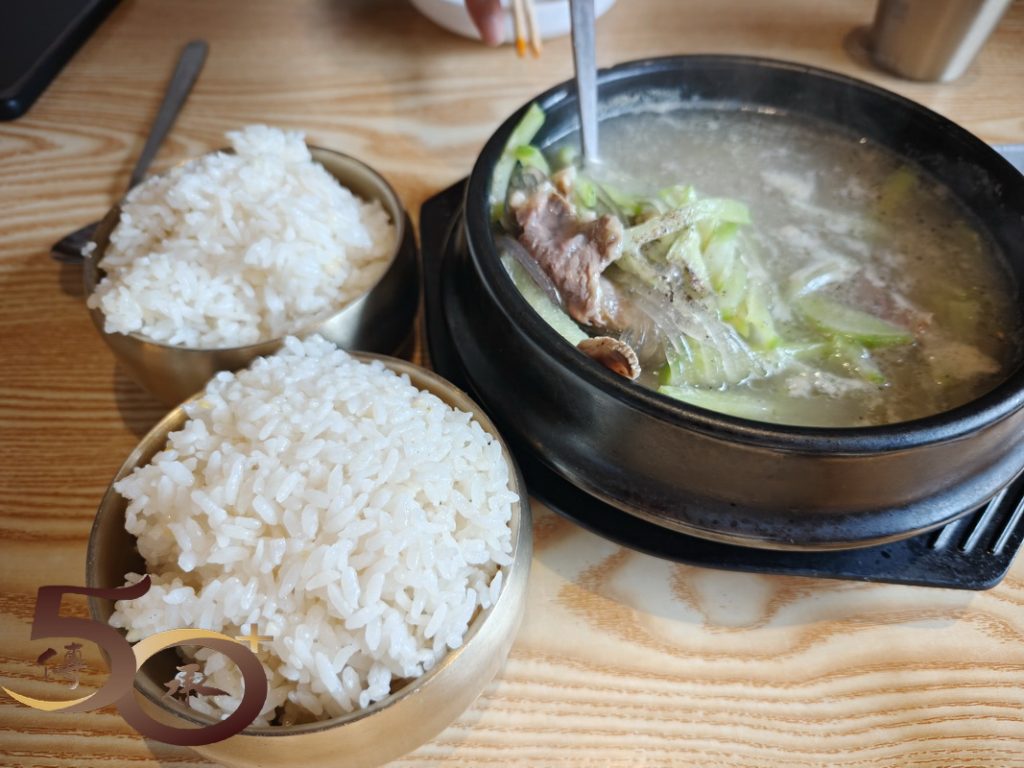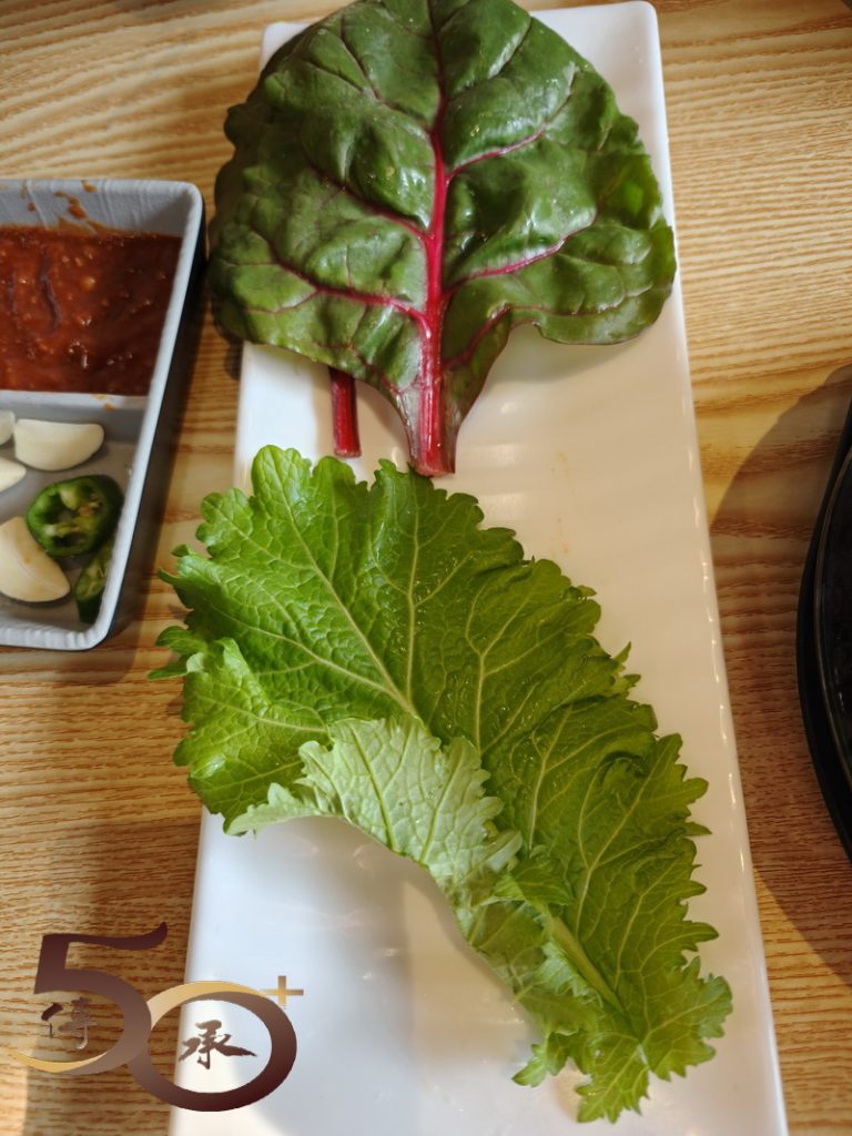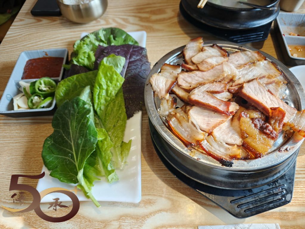 與老伴分別點了一個牛肉湯飯(25元),不單牛肉味濃,白飯更是任裝。昨晚因「韓酒換汽水」不果而未能吃得的肉包飯,這裏也有果香五花肉包飯(38元),上枱時香味撲鼻,較早年在南韓旅遊時所吃的,需要自己將整條五花腩烤熟再剪開的做法,「現成」的不單方便,更附上不同品種的蔬菜和特製醬料,加上生蒜和青椒,口感更佳。