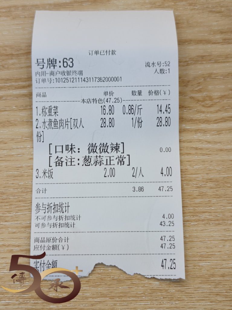 與老伴一起取了重0.86斤的蔬菜菇(14.45元),以及一客水煮魚片(28.8元),另加米飯(2元,任吃,還有雪耳杞子水)。由於北方的辣度標準有別於南方,因此下單時特別要求微辣,卻已十分夠味,配上自選的蔬菜和菇,尤其是「吸滿汁液」的豆卜,好吃之餘,簡簡單單又一餐。