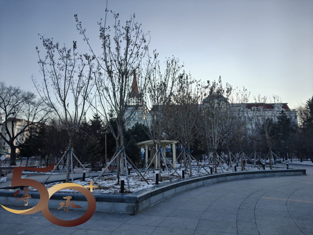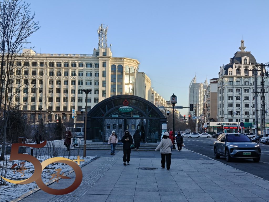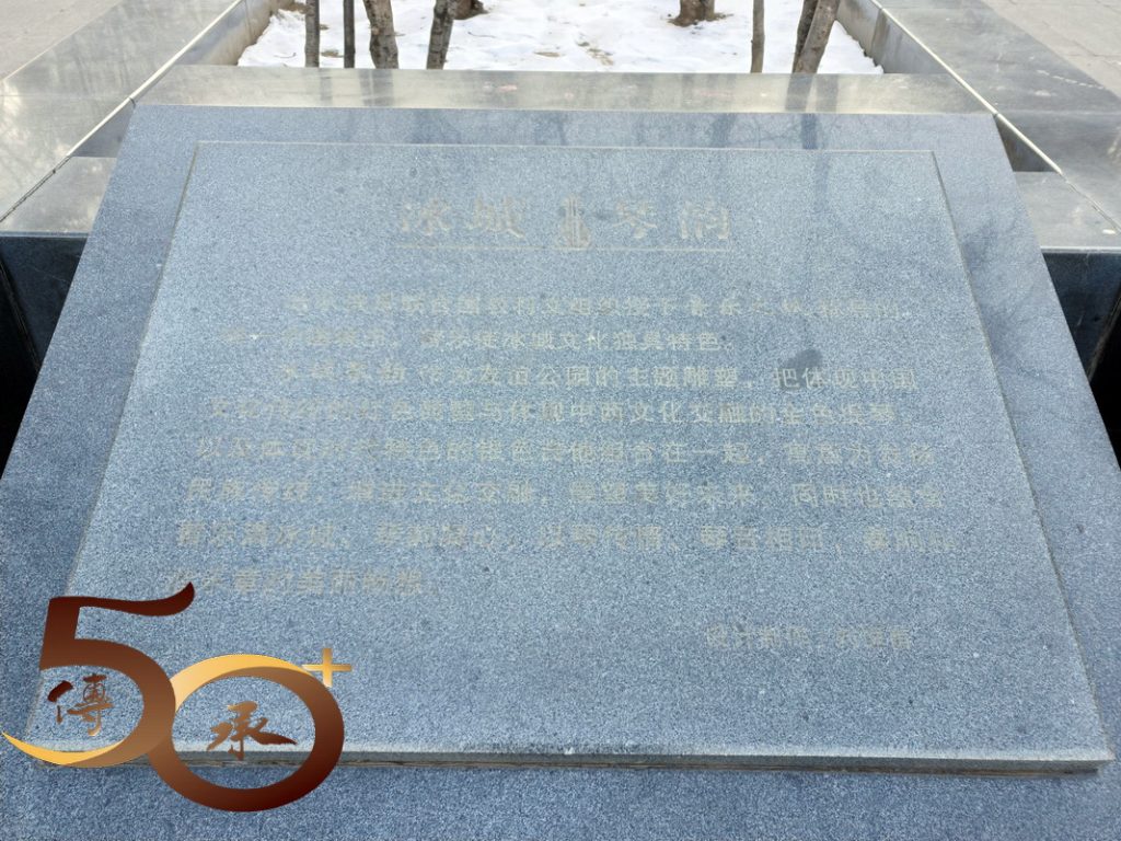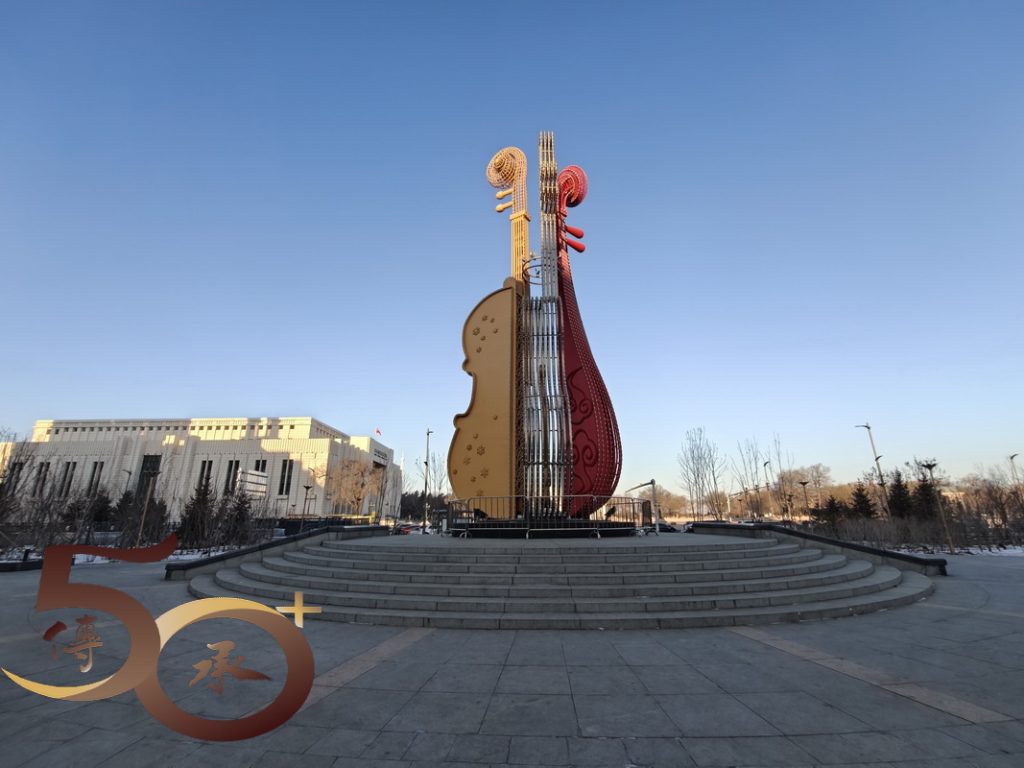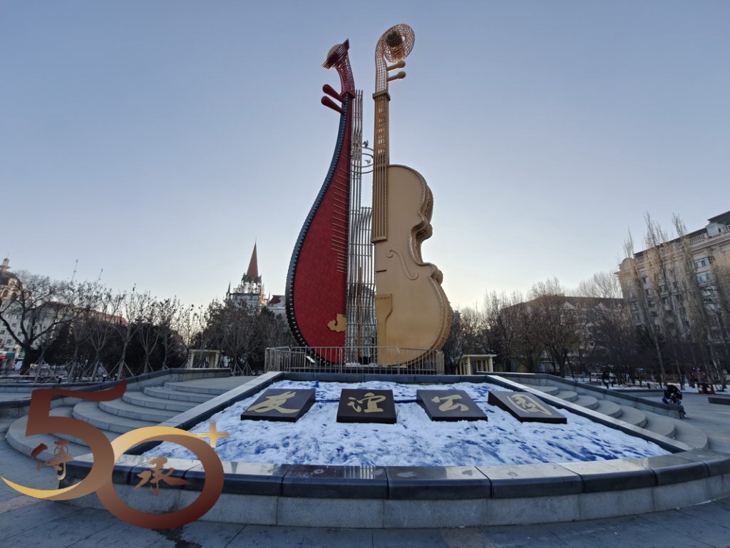 哈爾濱於2010年獲聯合國授予「音樂之城」的稱號,在人民廣場站前,轟立着名為《冰城琴韻》的雕塑,以兩座交織的樂器,表達這座被音樂浸潤的冰城,展現獨特中西文化融合的姿態。